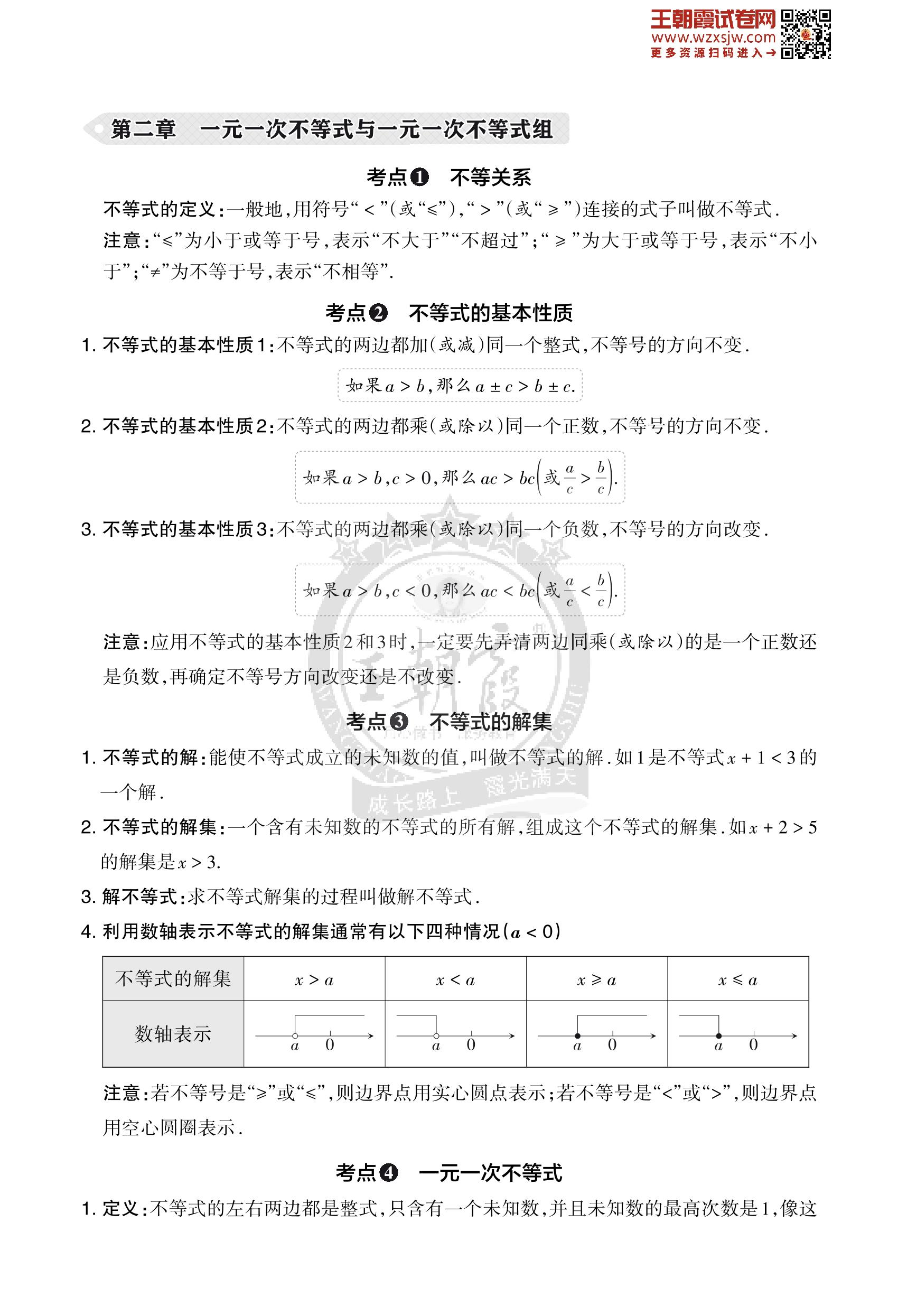 王朝霞期末知识梳理——第二章 一元一次不等式与一元一次不等式组八年级下册数学(北师版)