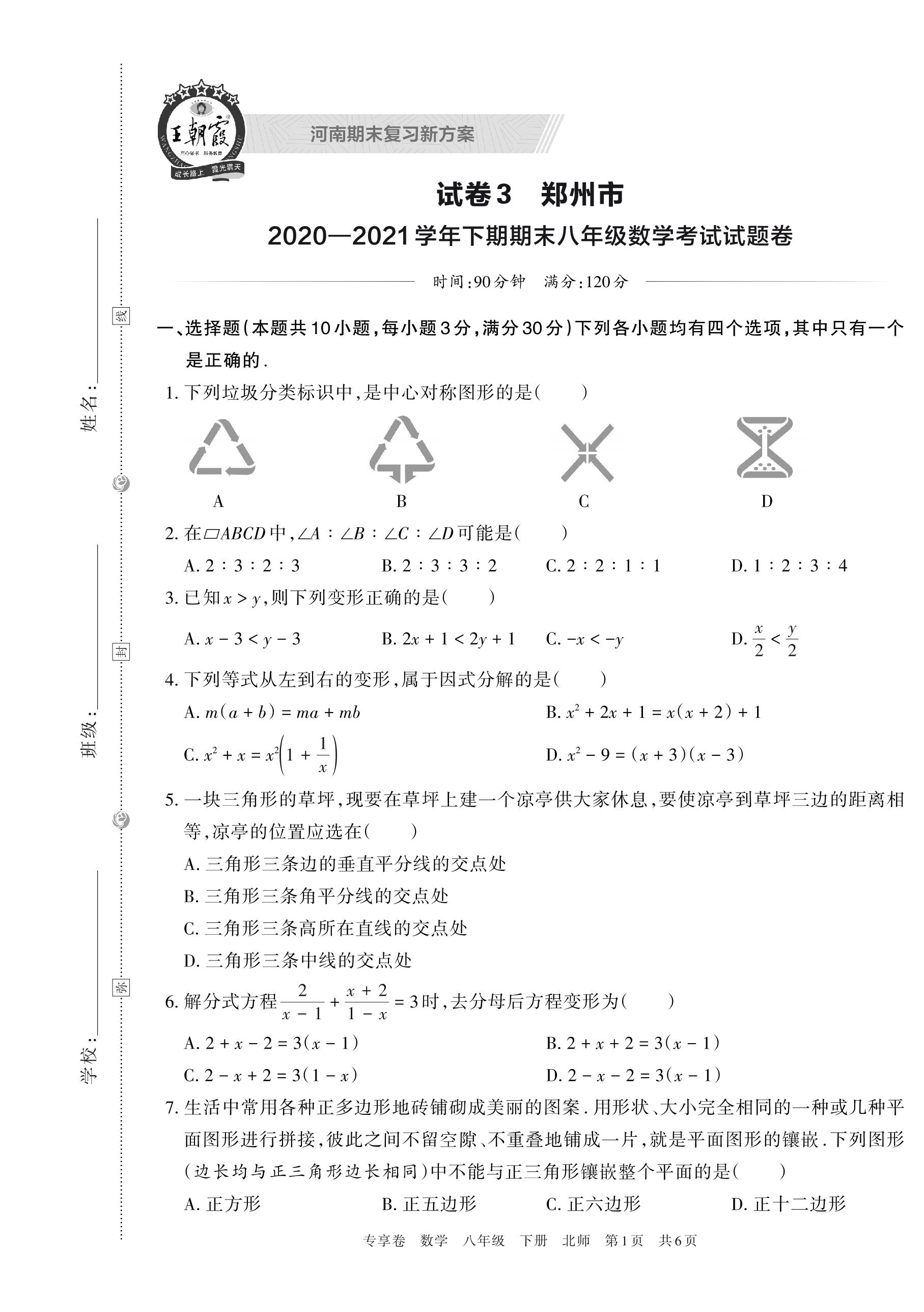 郑州市2020—2021学年下期期末八年级数学考试试题卷(北师版)【3】