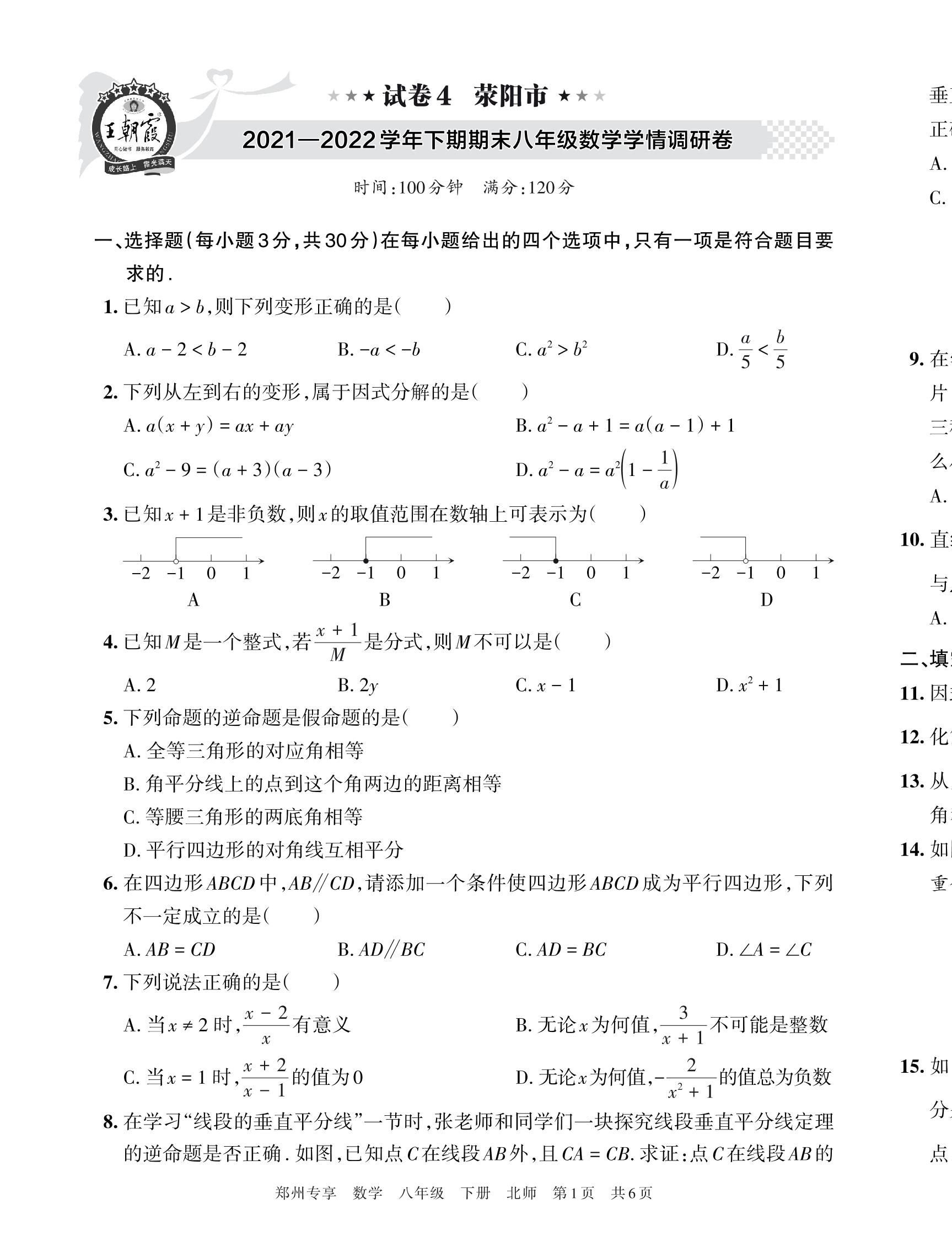 荥阳市2021—2022学年下期期末八年级数学学情调研卷【4】