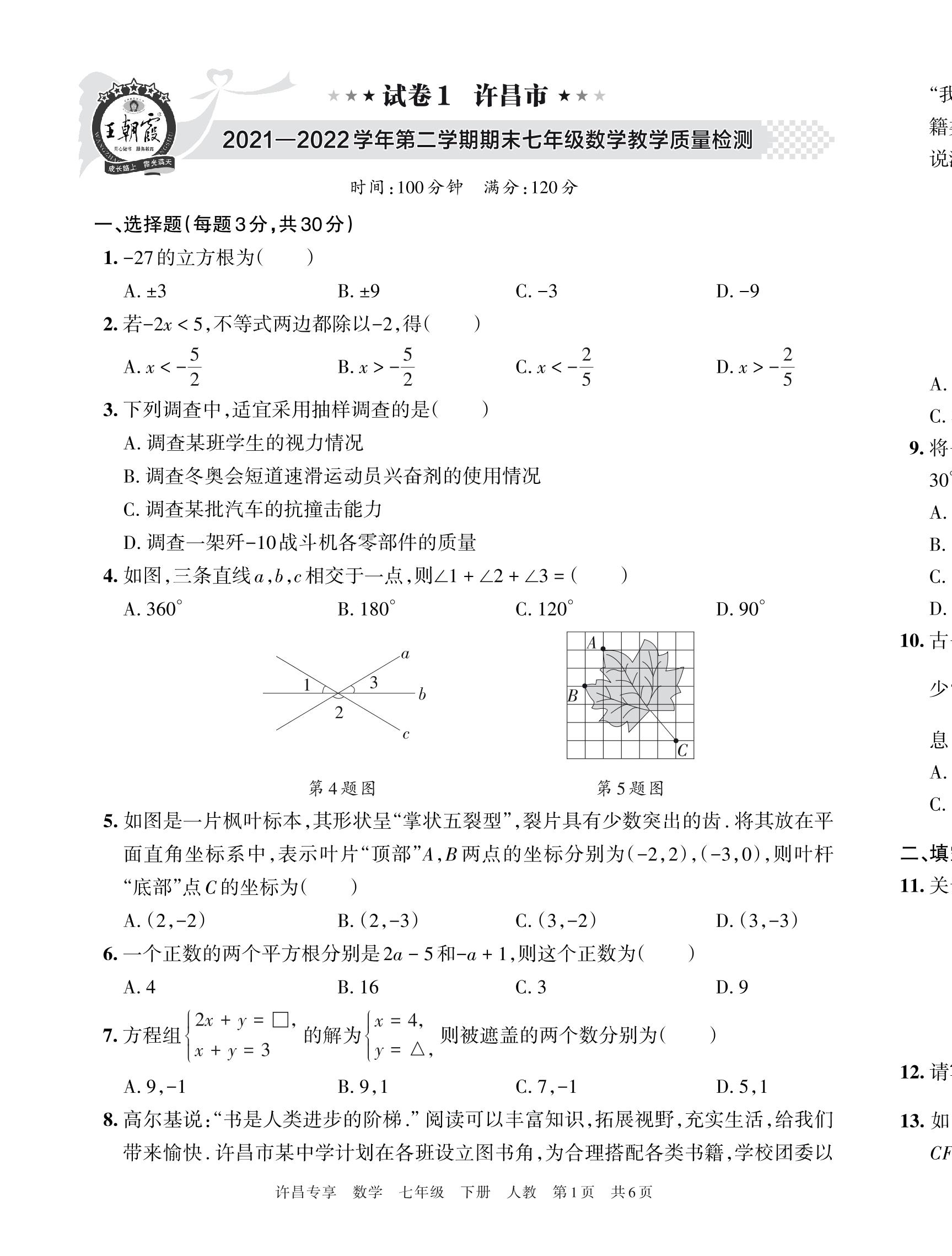 许昌市2021—2022学年第二学期期末七年级数学教学质量检测(人教版)【1】