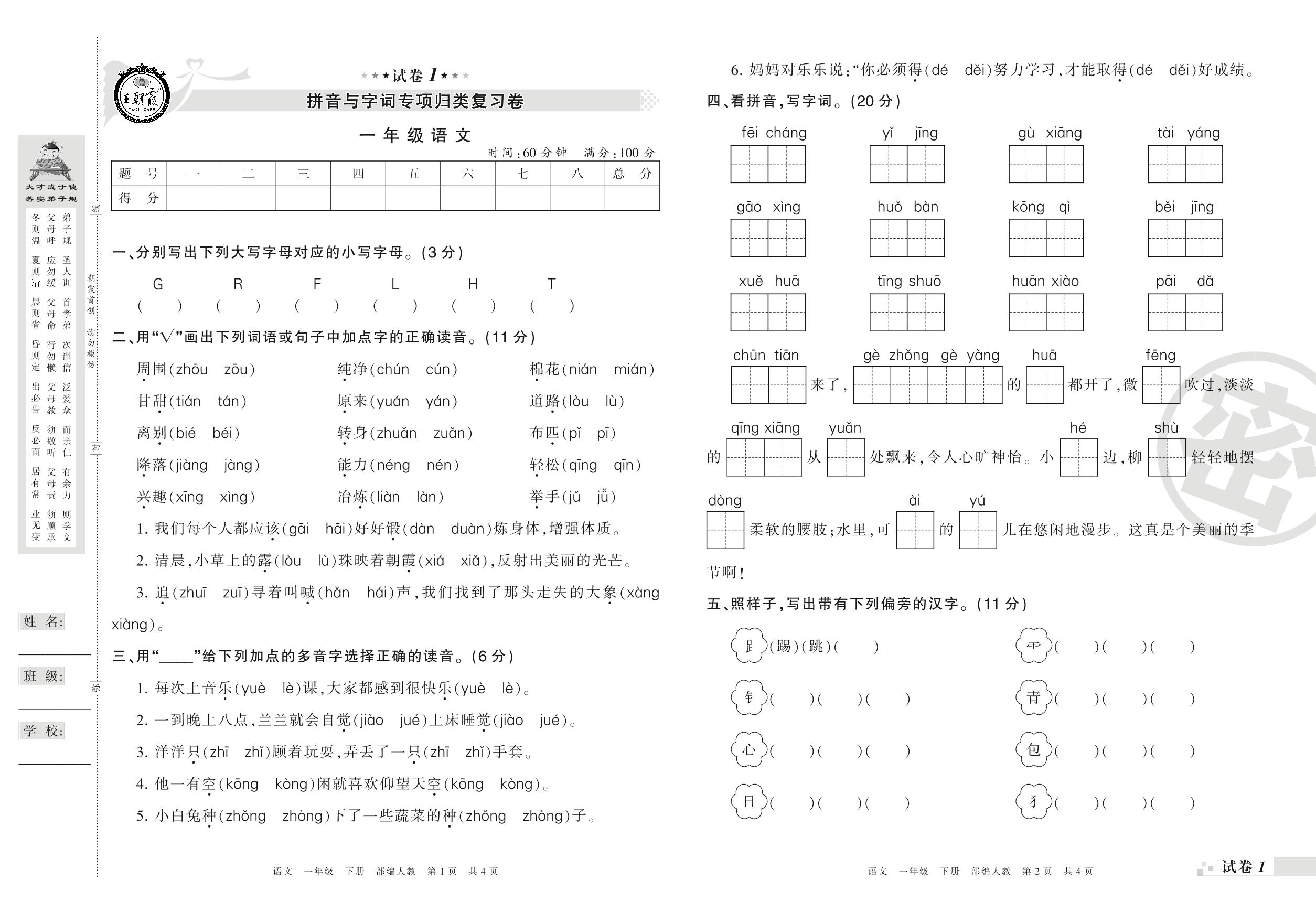 王朝霞期末专项卷——拼音与字词专项归类复习卷一年级下册语文(人教版)_R210731190829【1】