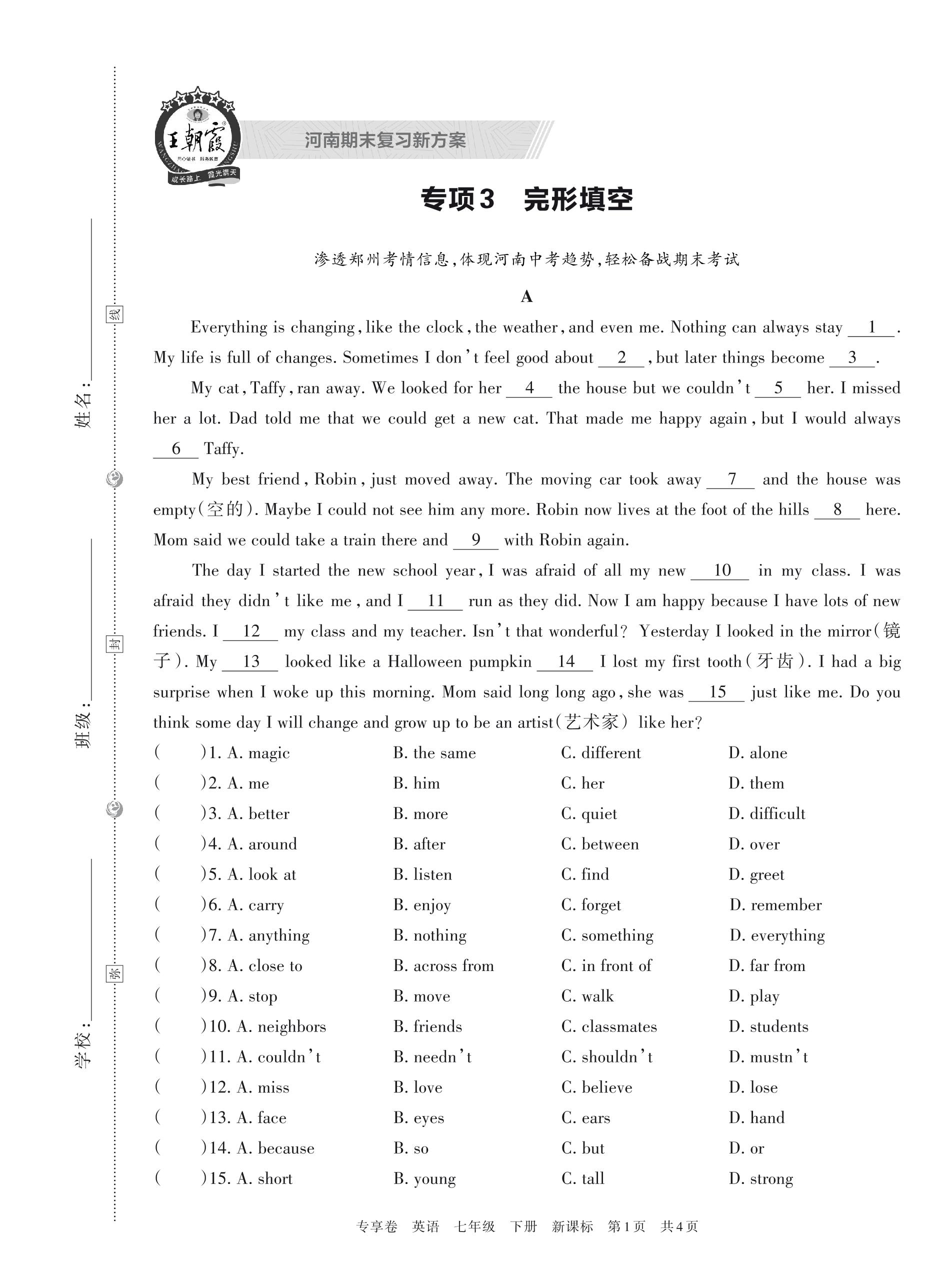王朝霞期末专项卷——完形填空七年级下册英语(新课标版)_R230504163544125【3】