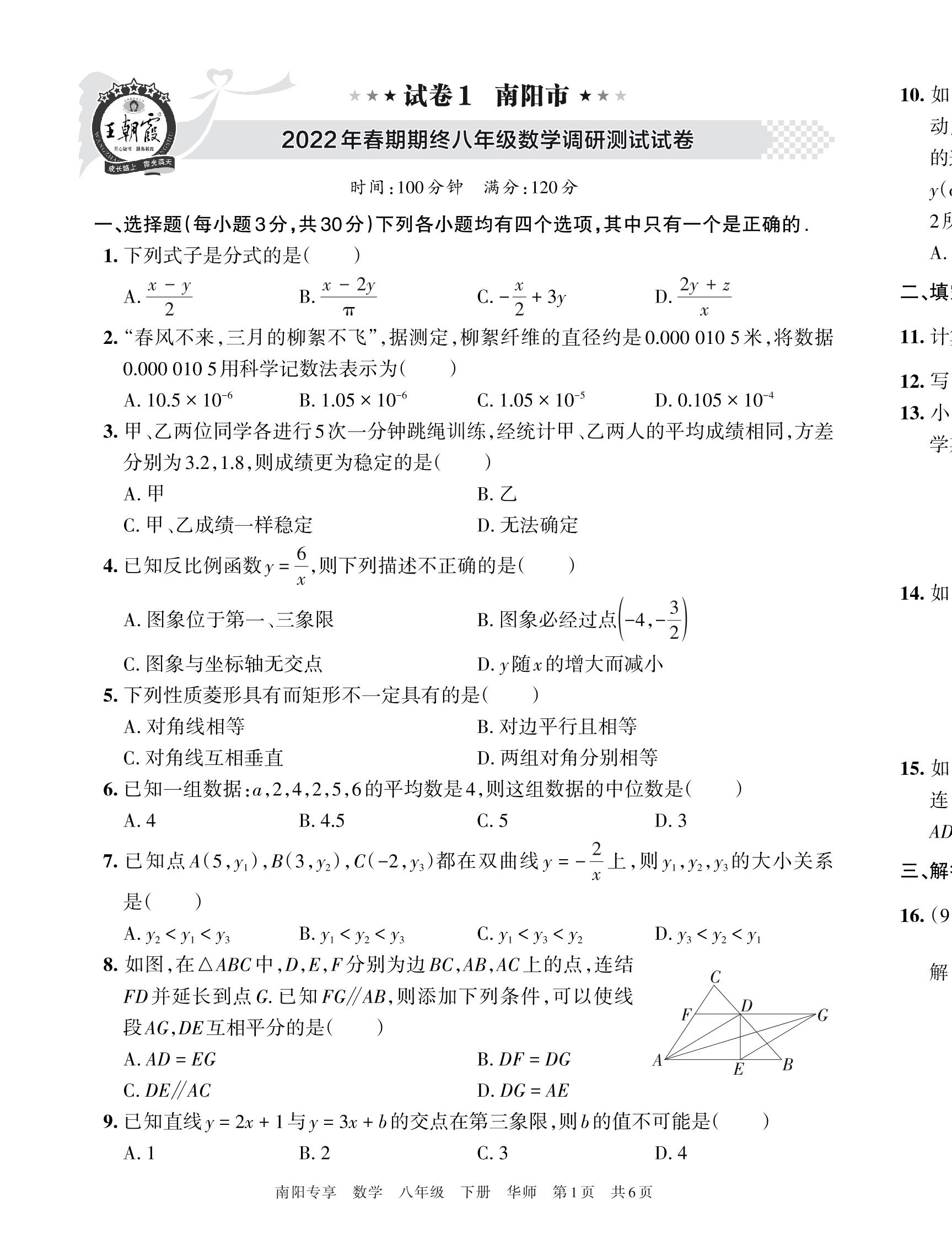 南阳市2022年春期期终八年级数学调研测试试卷(华师版)【1】