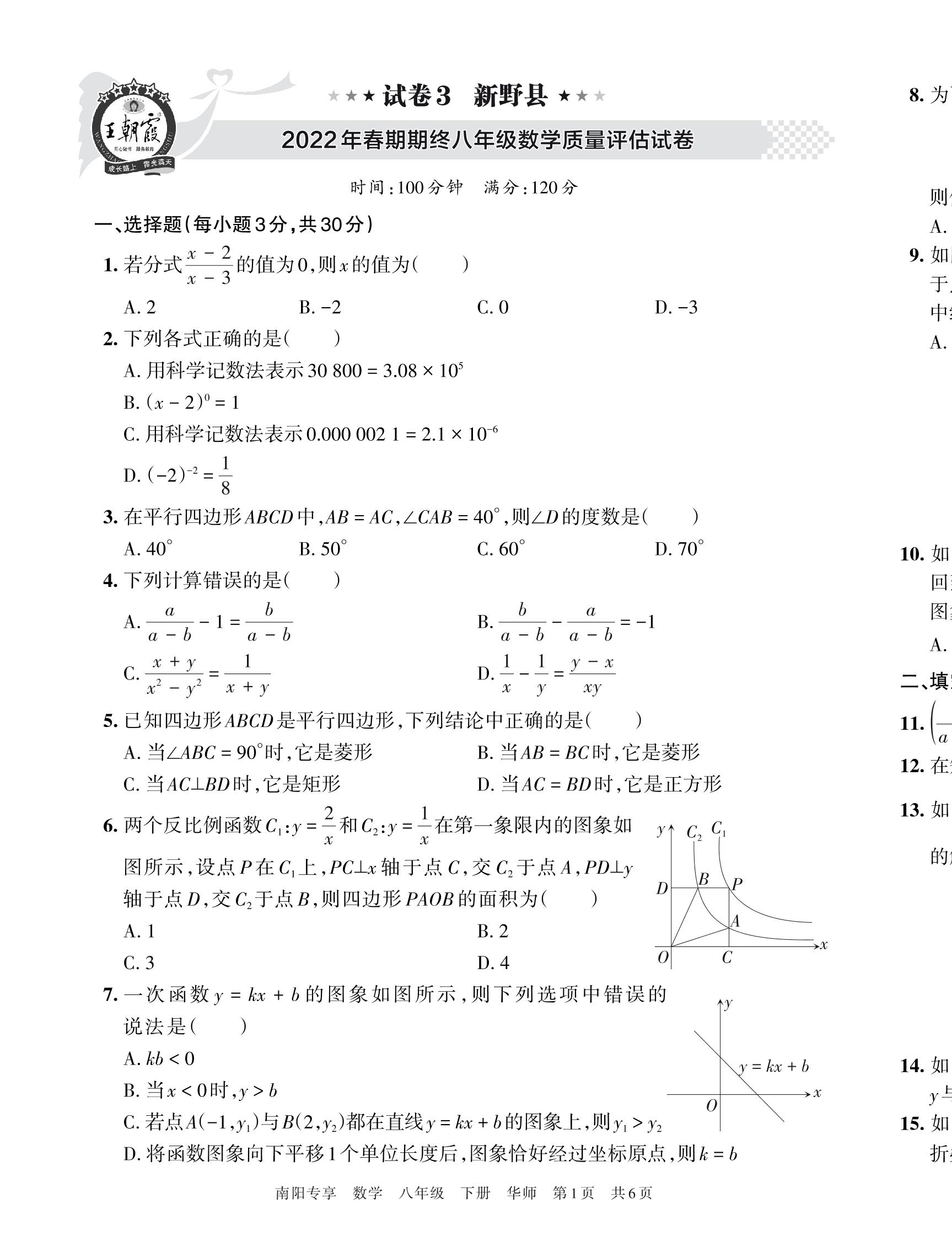 新野县2022年春期期终八年级数学质量评估试卷(华师版)【3】
