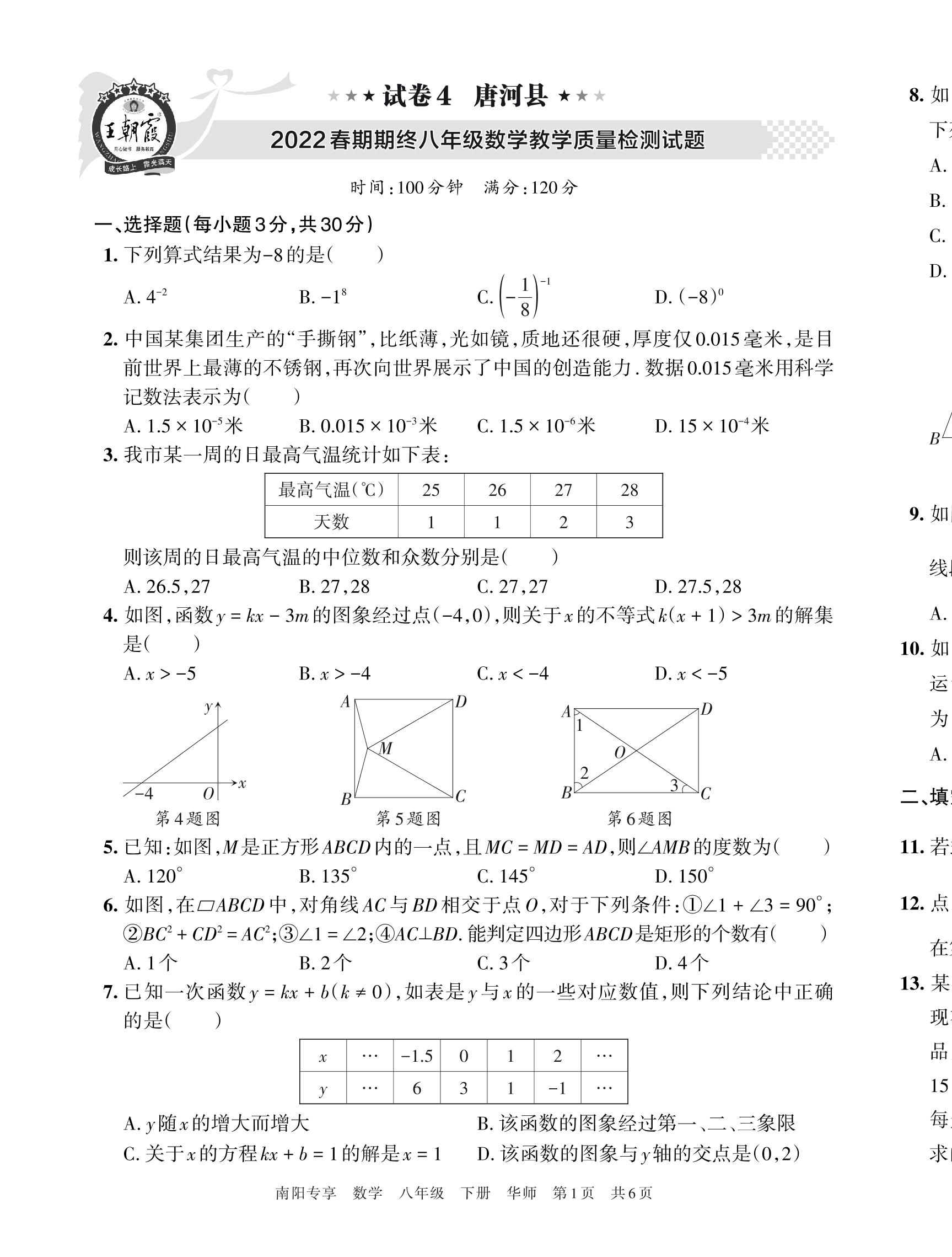 唐河县2022春期期终八年级数学教学质量检测试题(华师版)【4】