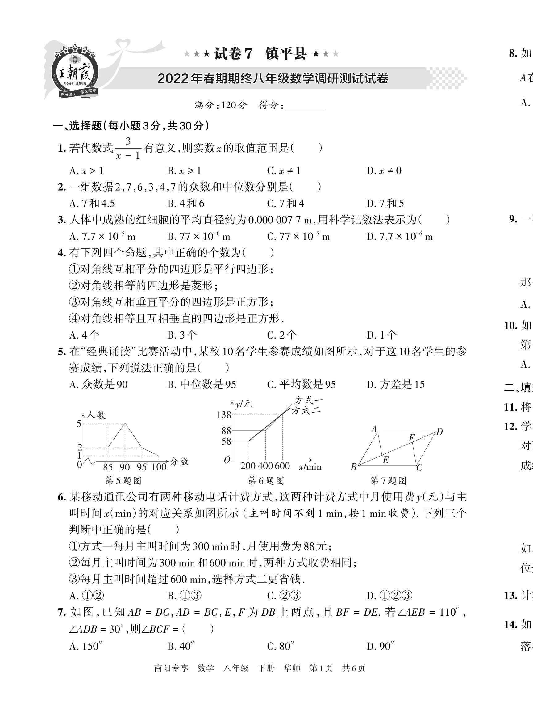 镇平县2022年春期期终八年级数学调研测试试卷(华师版)【7】