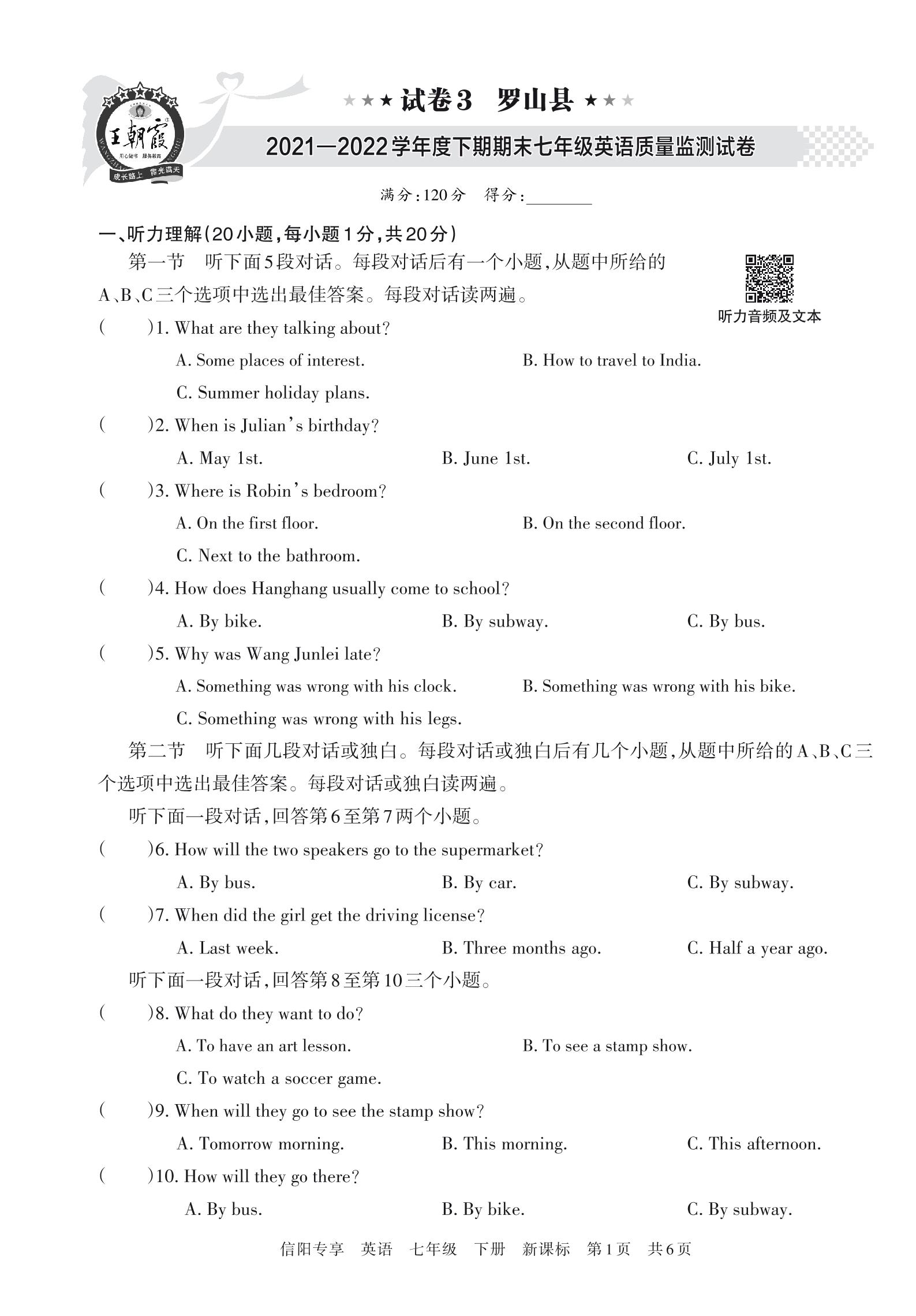 罗山县2021—2022学年度下期期末七年级英语质量监测试卷(新课标版)【3】
