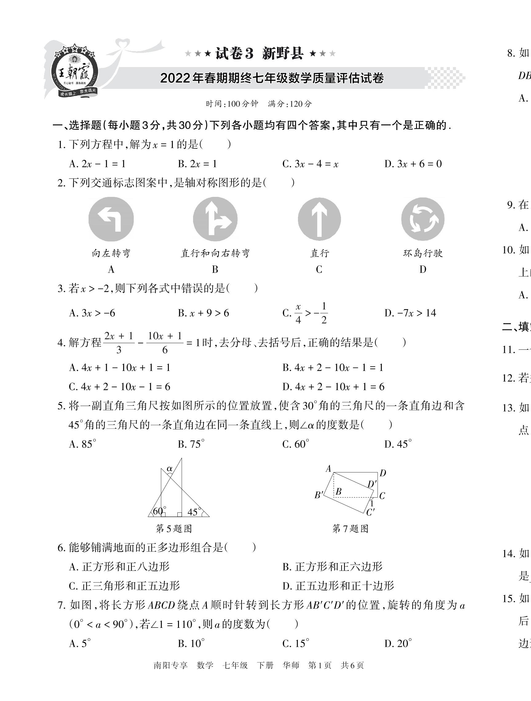 新野县2022年春期期终七年级数学质量评估试卷(华师版)【3】