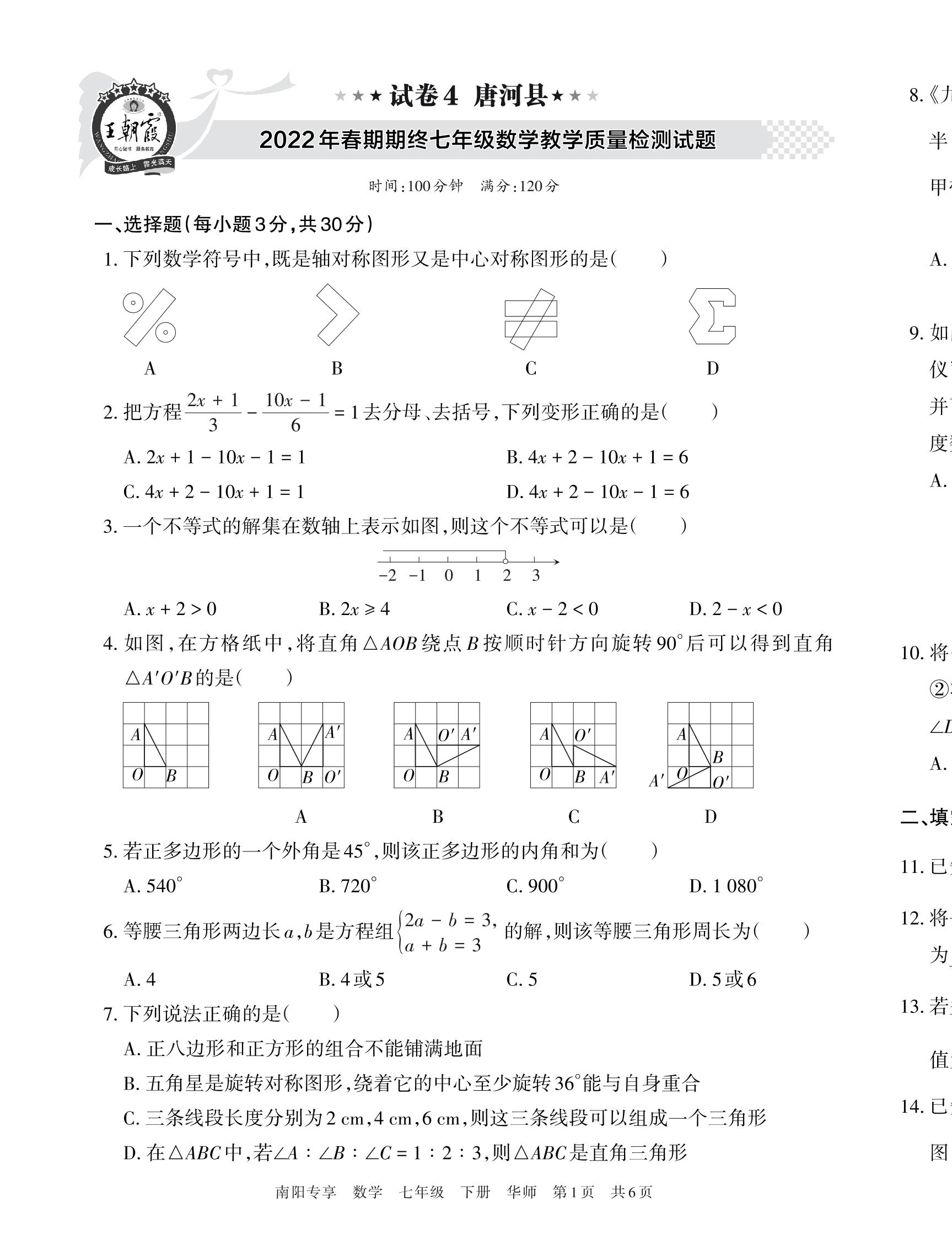 唐河县2022年春期期终七年级数学教学质量检测试题(华师版)【4】