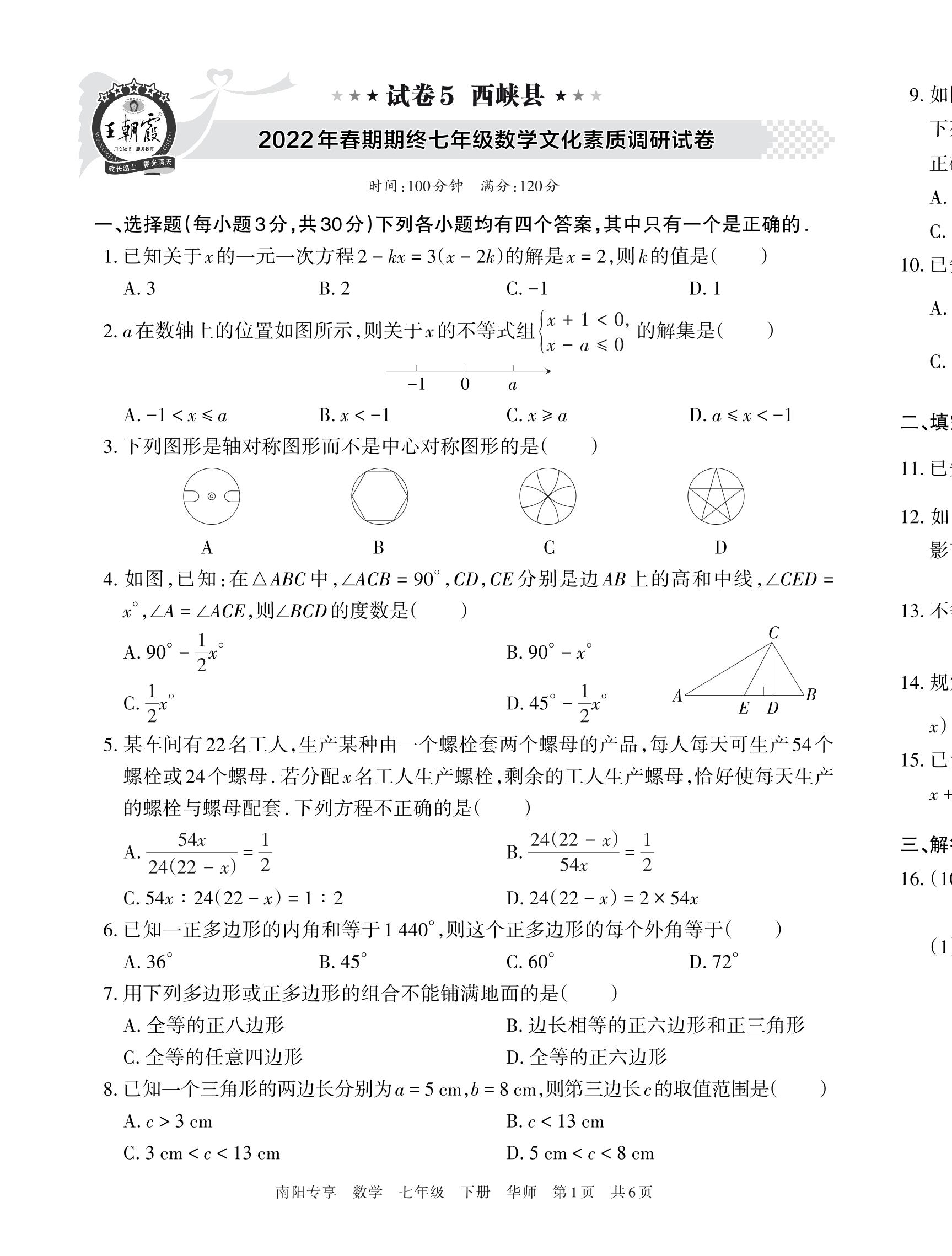 西峡县2022年春期期终七年级数学文化素质调研试卷(华师版)【5】