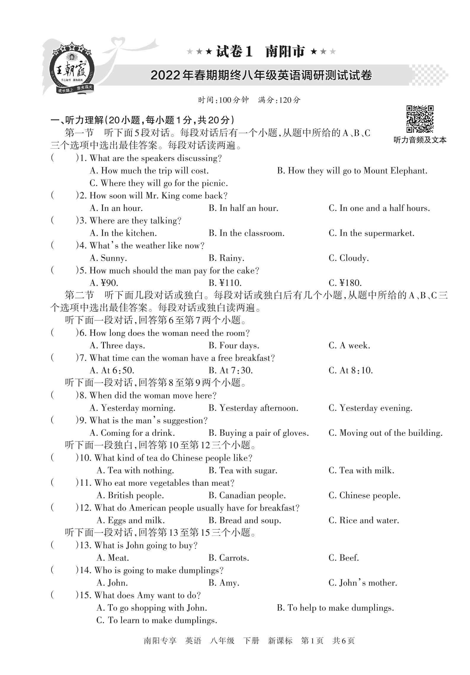 南阳市2022年春期期终八年级英语调研测试试卷(新课标版)【1】