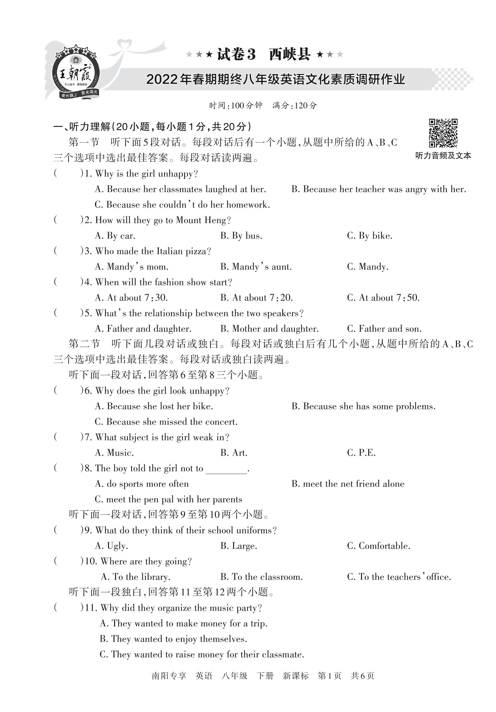 西峡县2022年春期期终八年级英语文化素质调研作业(新课标版)【3】