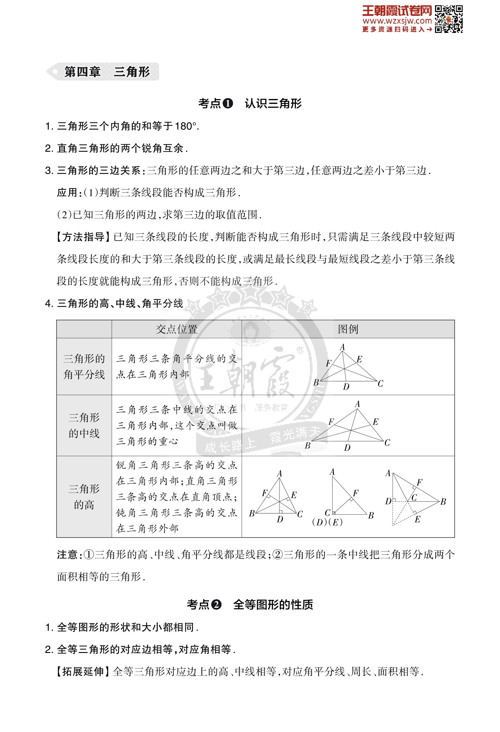 王朝霞期末知识梳理——第四章 三角形七年级下册数学(北师版)