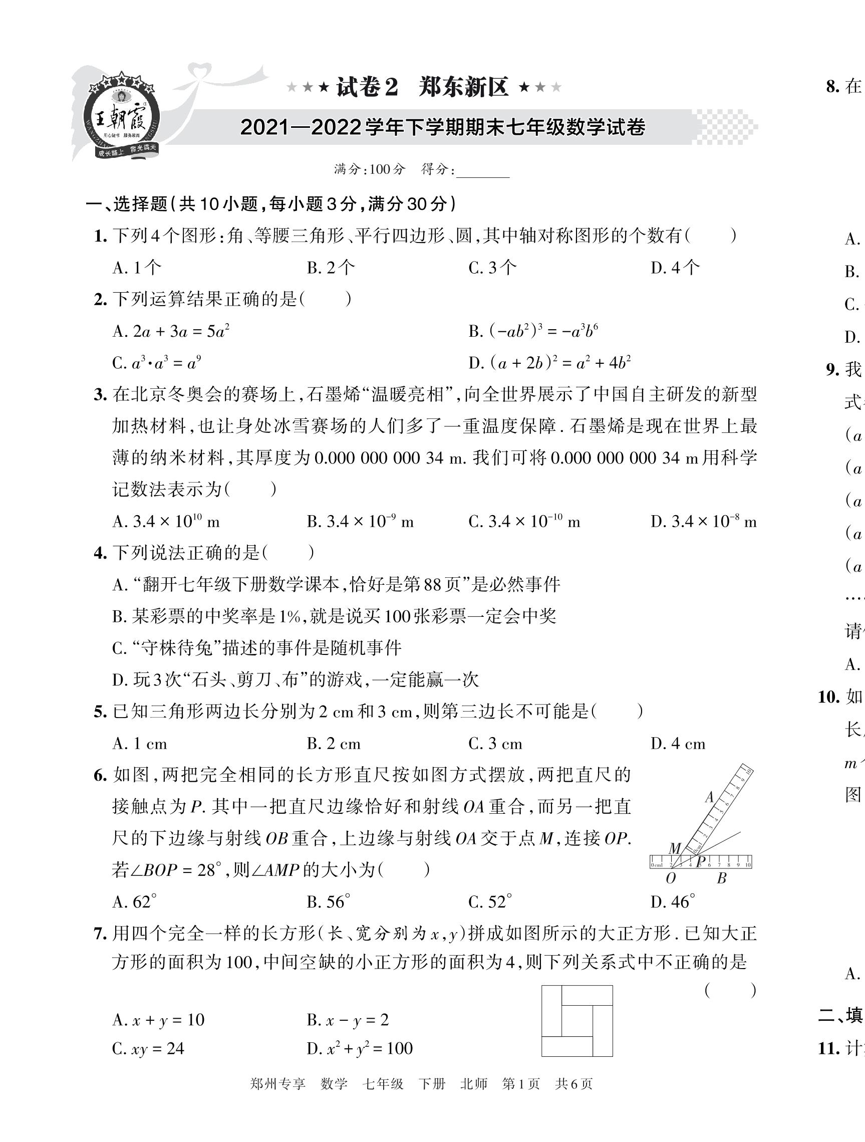 郑东新区2021—2022学年下学期期末七年级数学试卷【2】