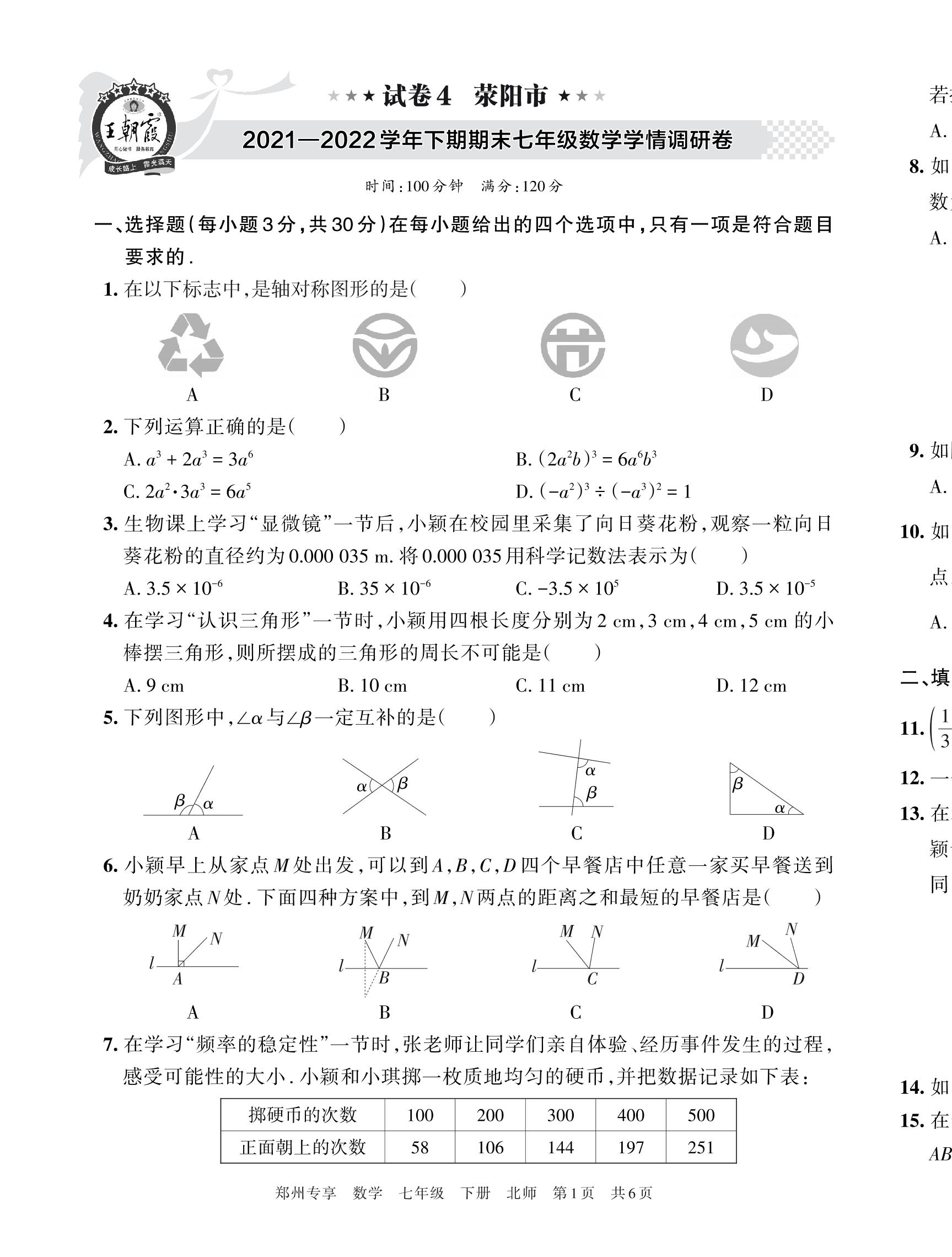 荥阳市2021—2022学年下期期末七年级数学学情调研卷【4】