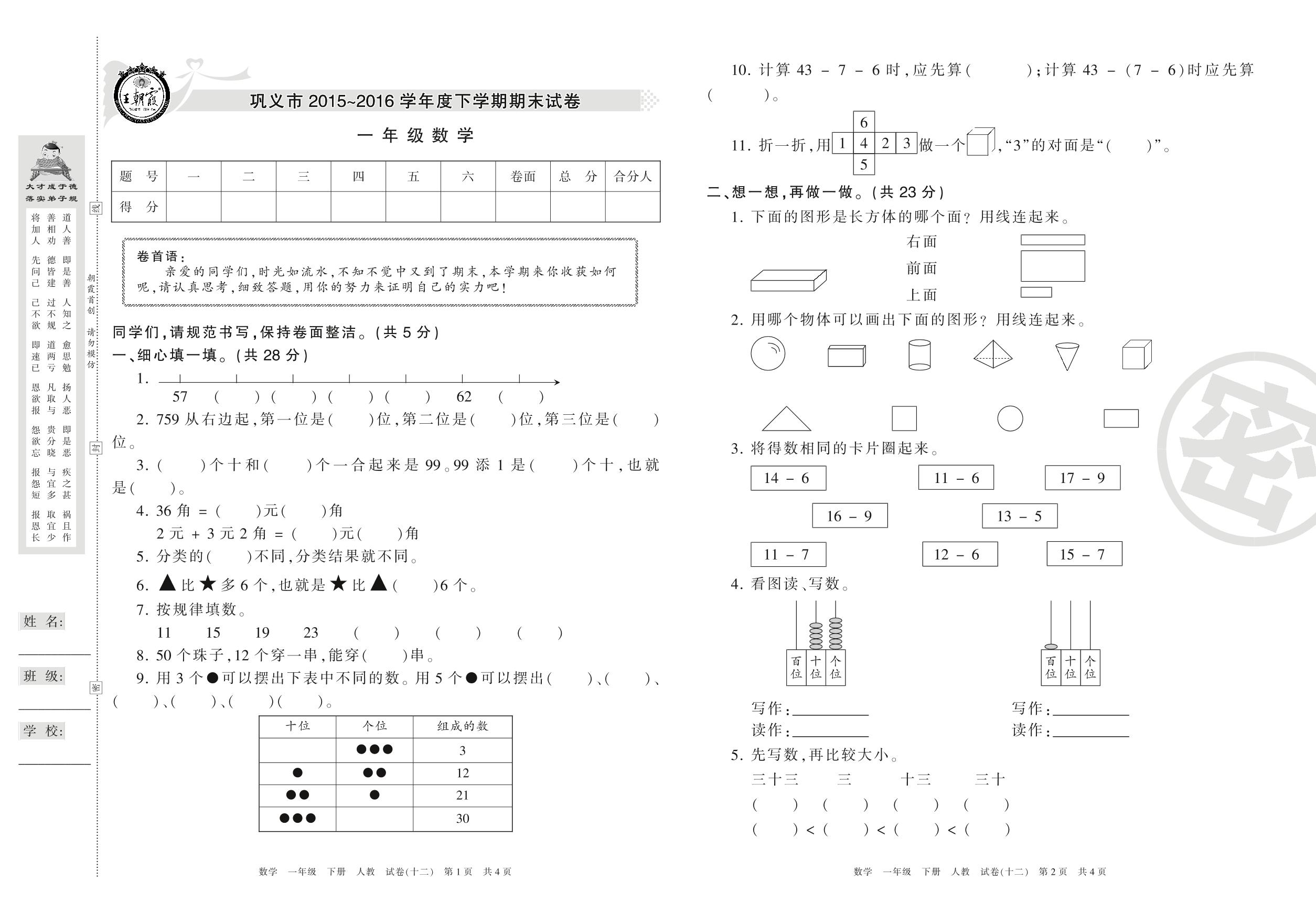 2015-2016学年第二学期巩义市一年级数学试卷(人教版)【12】
