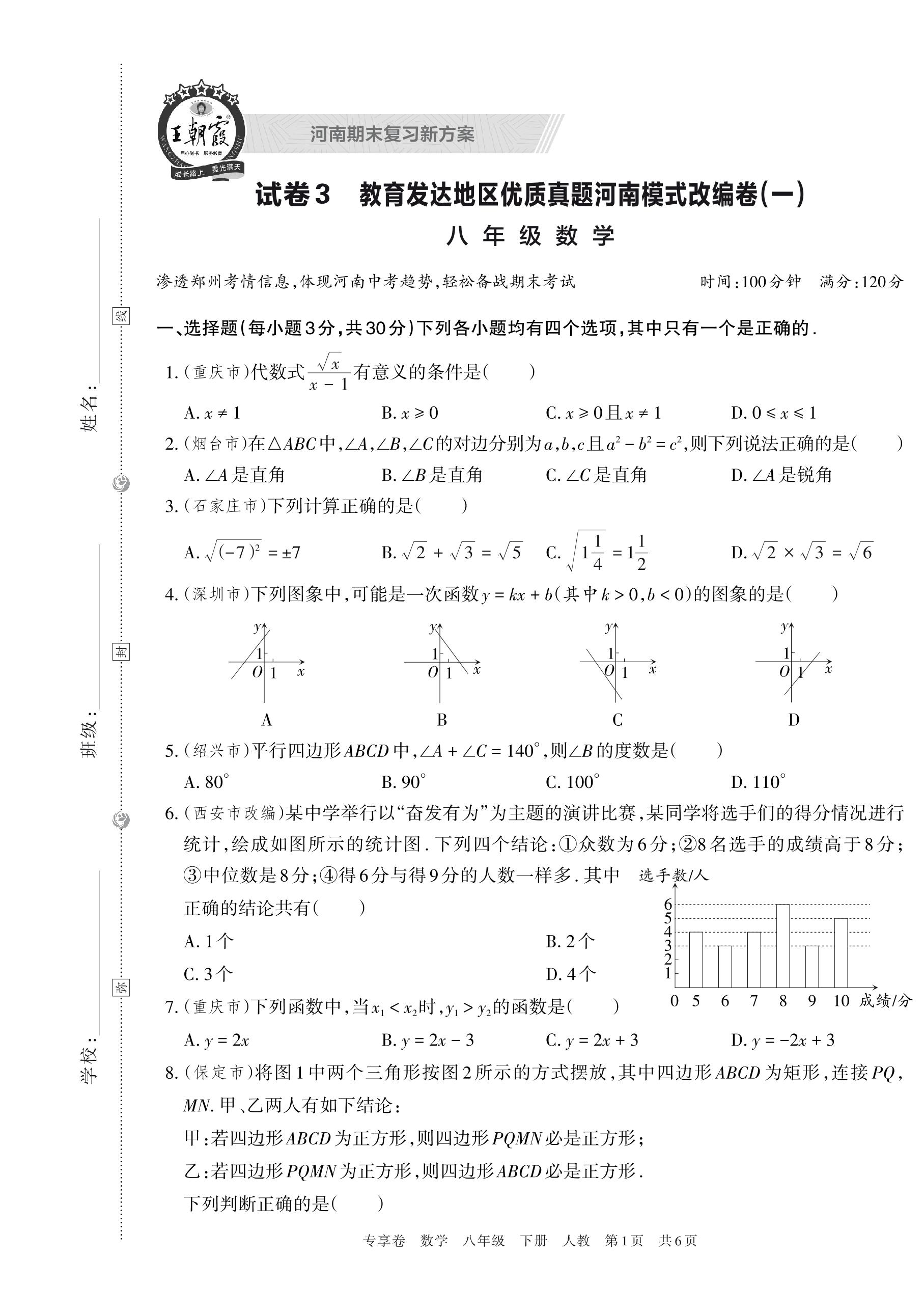教育发达地区优质真题河南模式改编卷(一)八年级下册数学(人教版)【3】