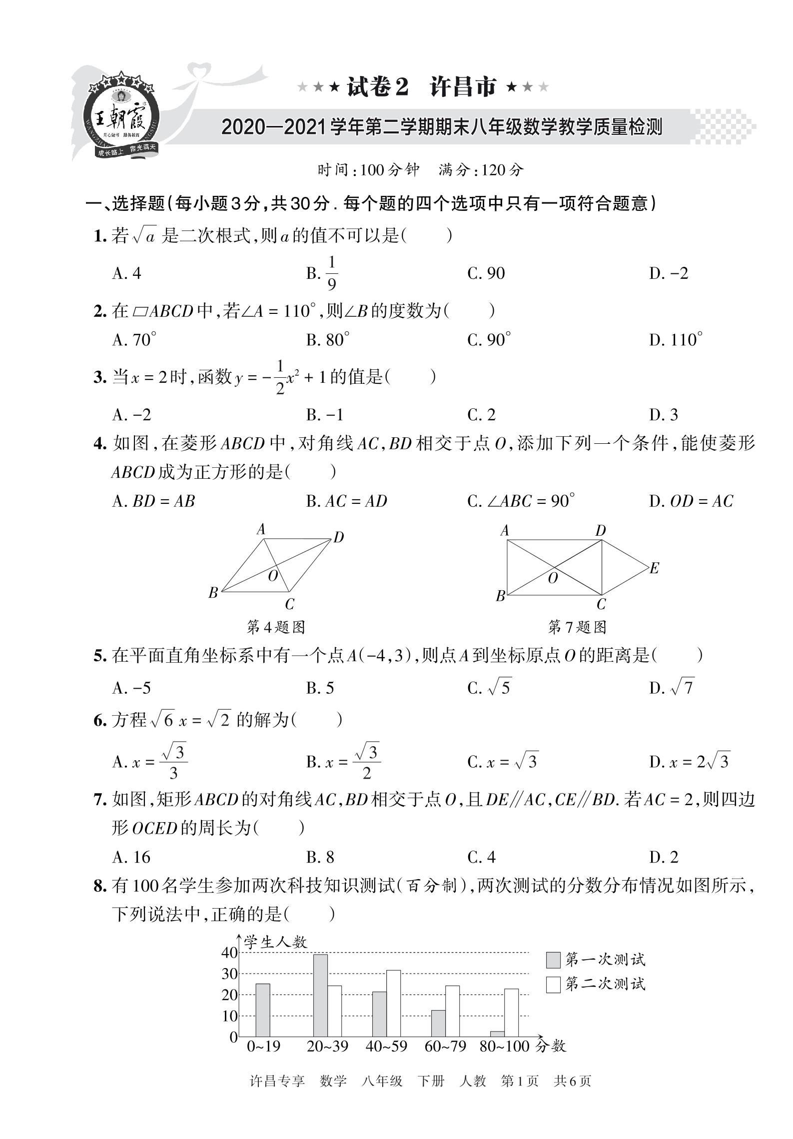 许昌市2020—2021学年第二学期期末八年级数学教学质量检测(人教版)【2】