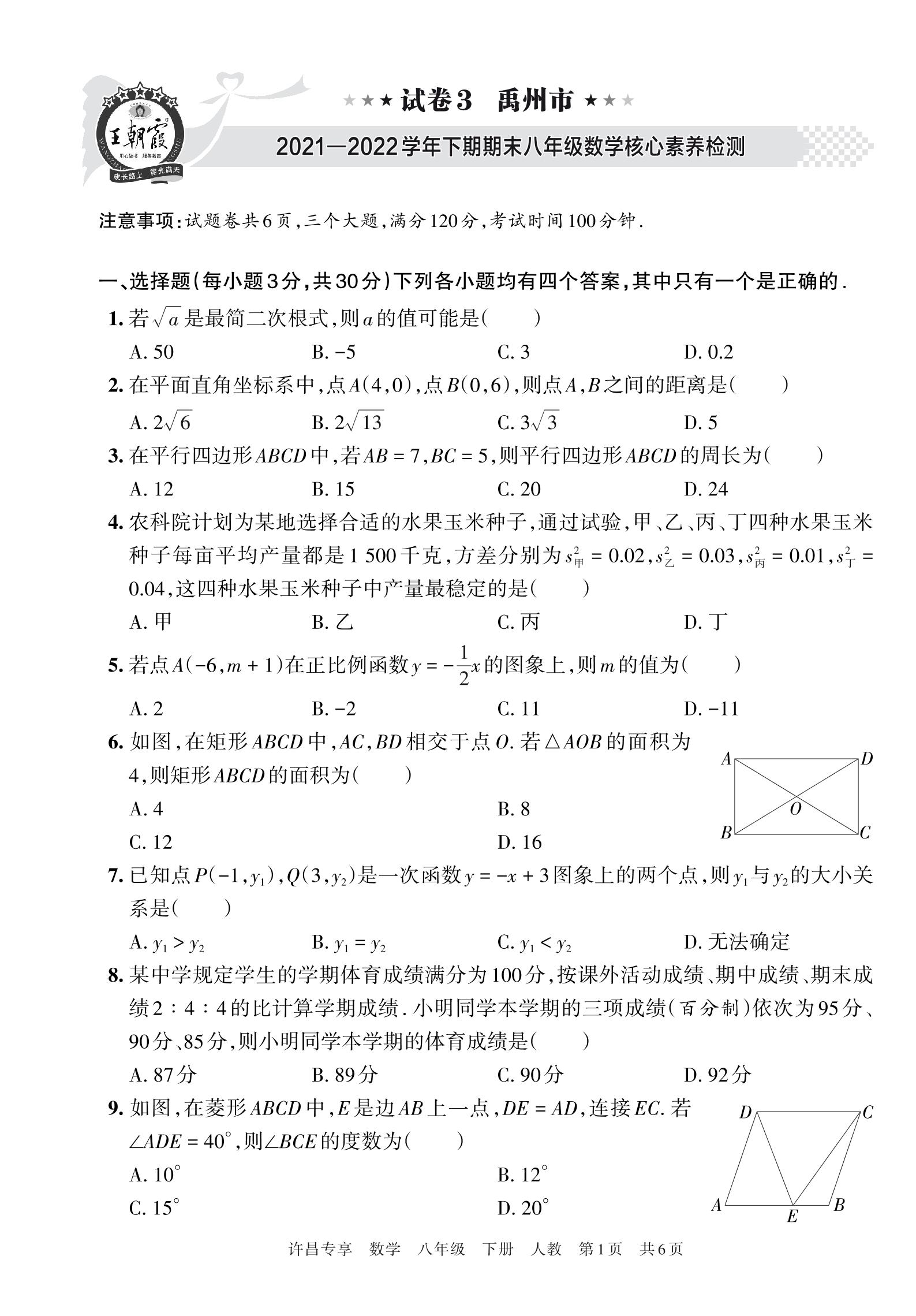 禹州市2021—2022学年下期期末八年级数学核心素养检测(人教版)【3】