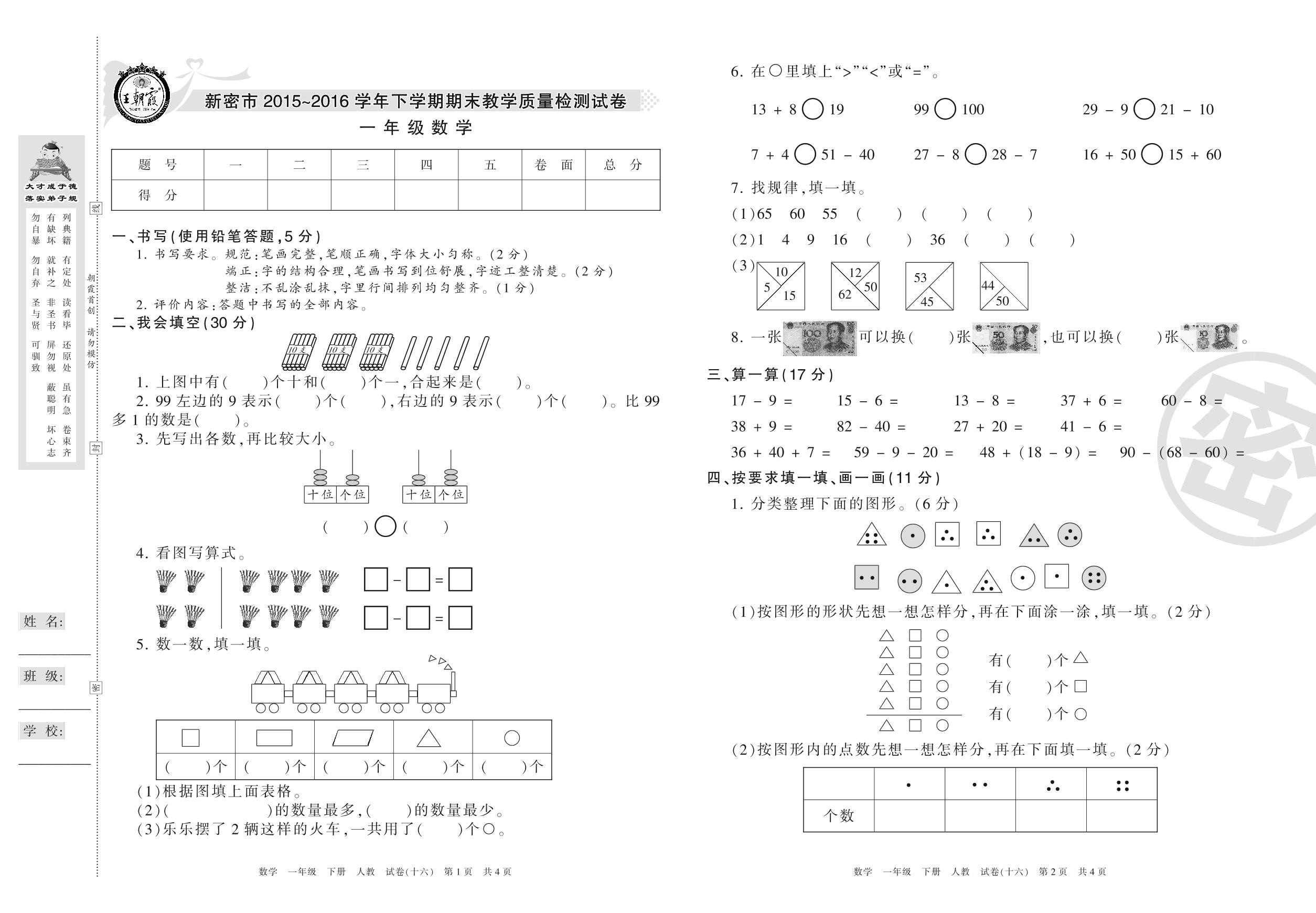 2015-2016学年第二学期新密市一年级数学试卷(人教版)【16】