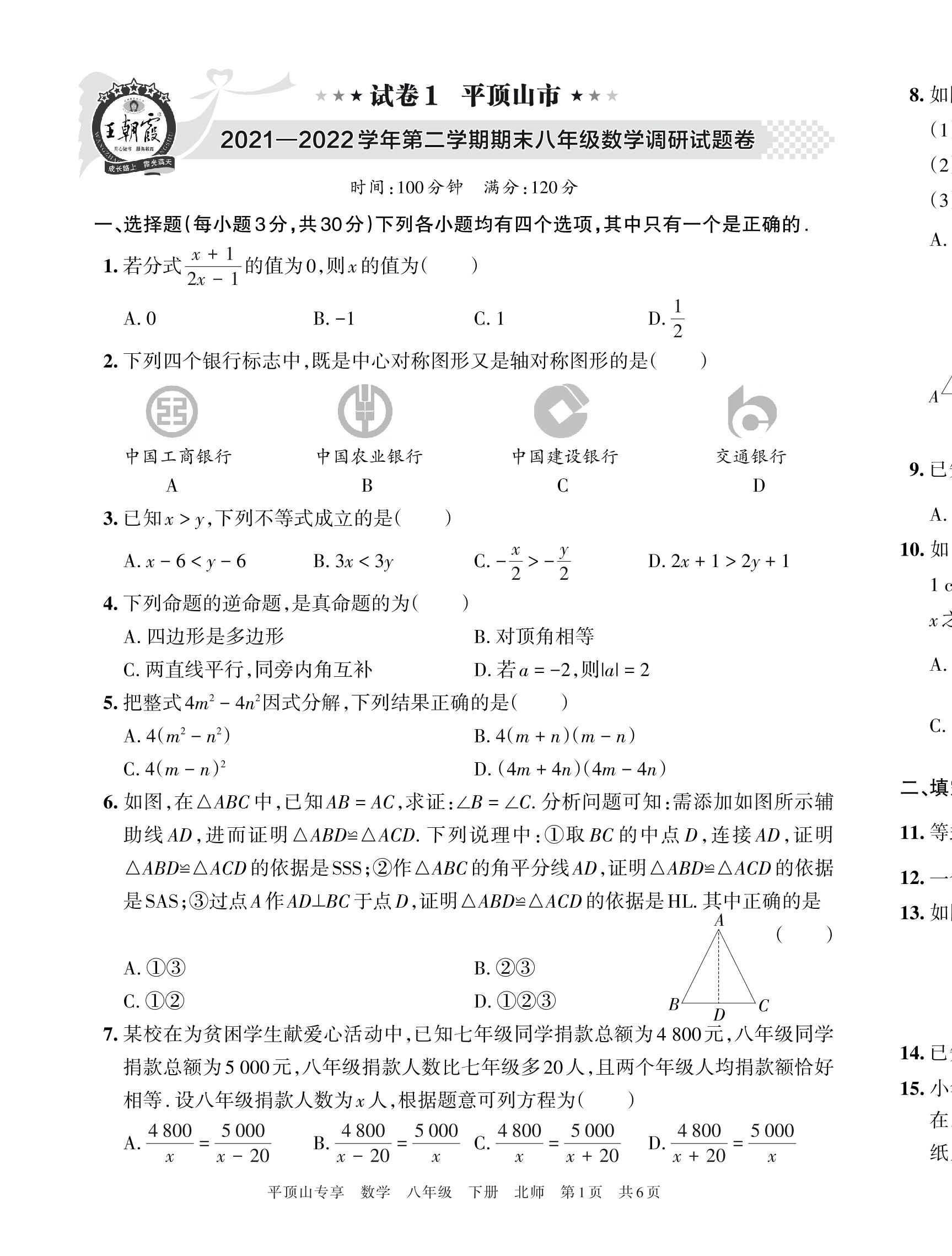 平顶山市2021—2022学年第二学期期末八年级数学调研试题卷(北师版)【1】