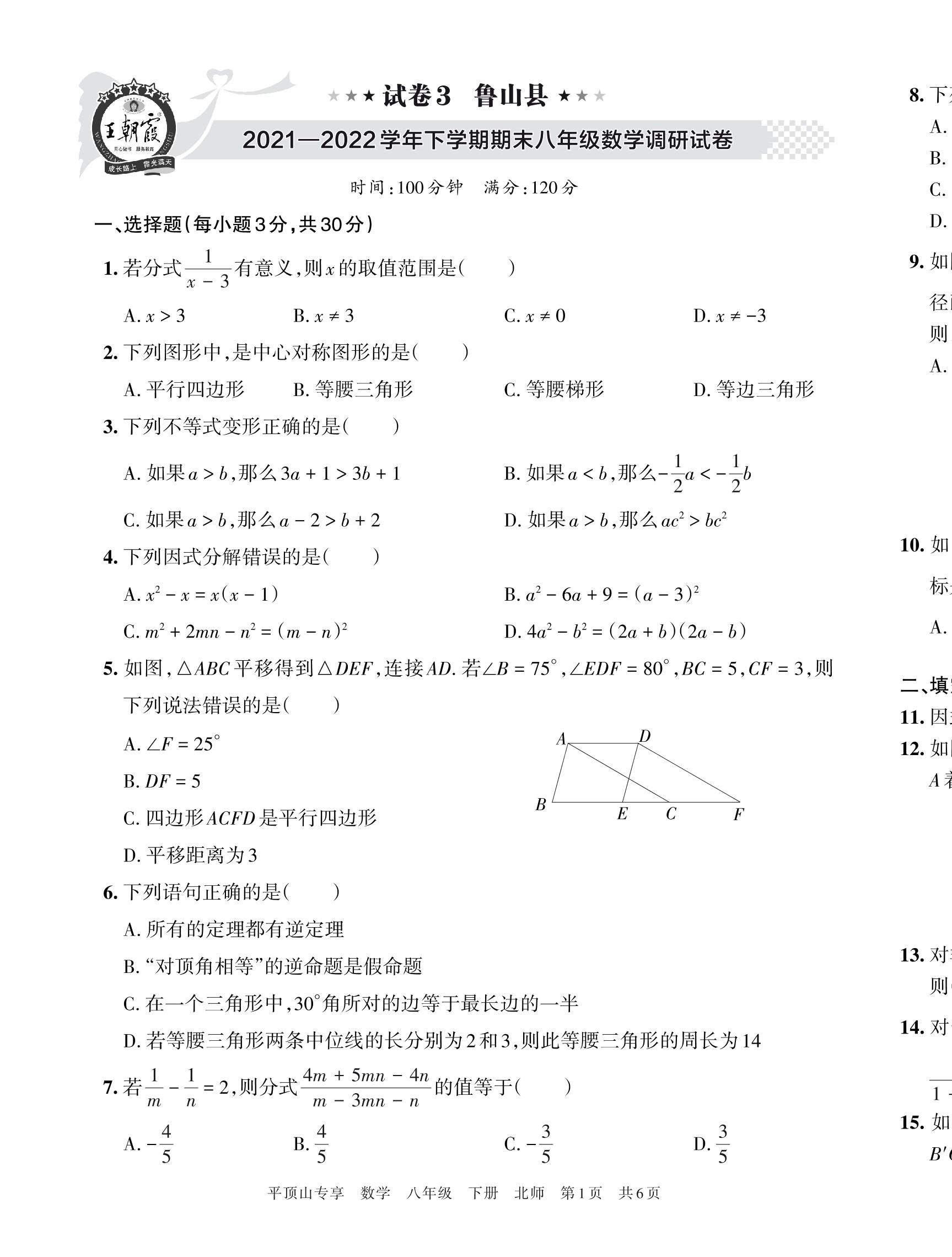 鲁山县2021—2022学年下学期期末八年级数学调研试卷(北师版)【3】