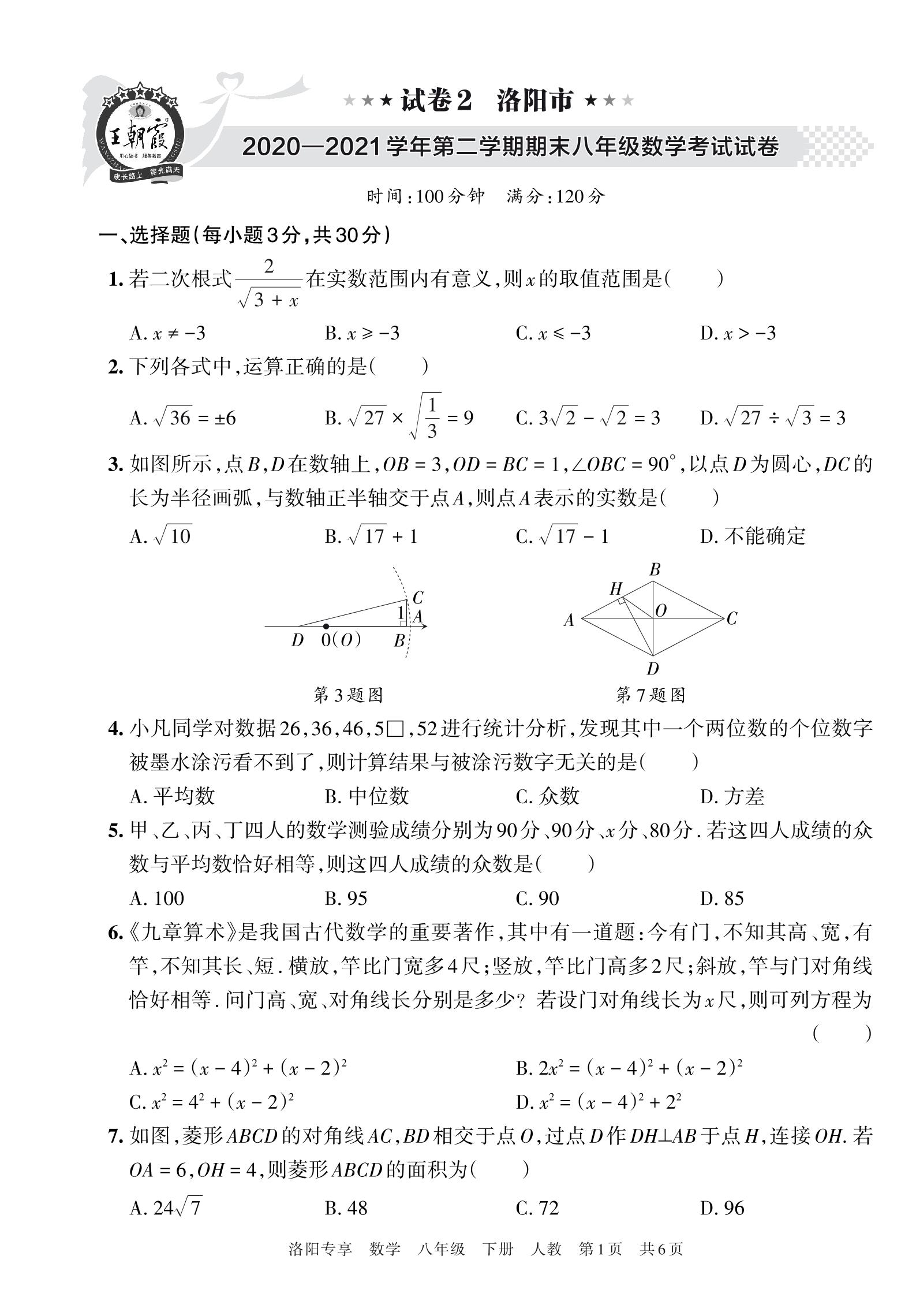 洛阳市2020—2021学年第二学期期末八年级数学考试试卷(人教版)【2】