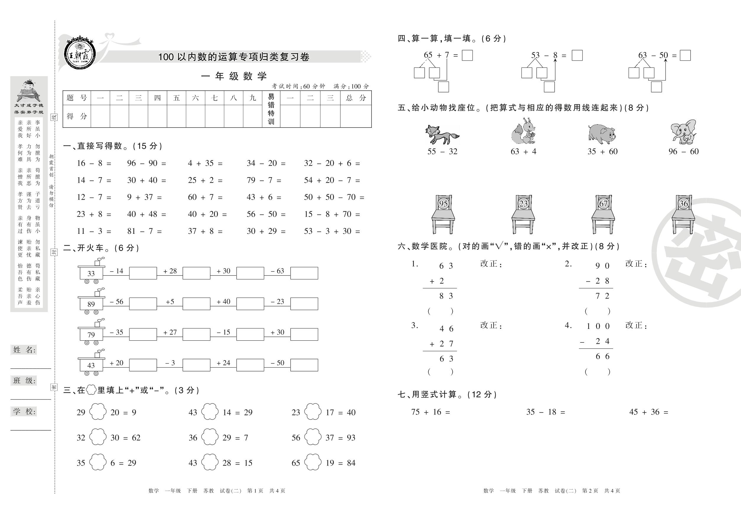 一年级数学苏教版下册专项卷