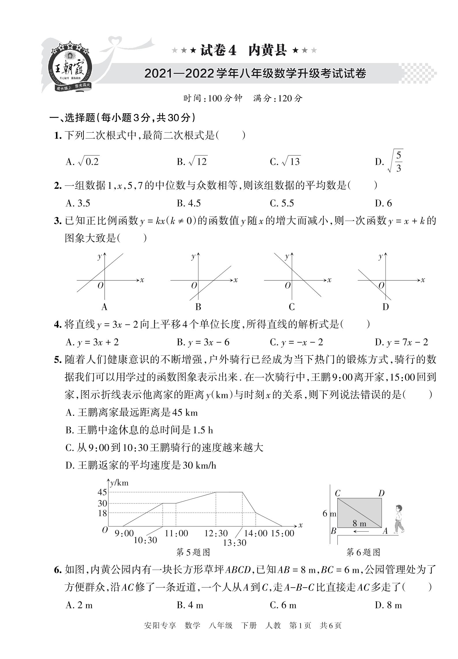 内黄县2021—2022学年八年级数学升级考试试卷(人教版)【4】