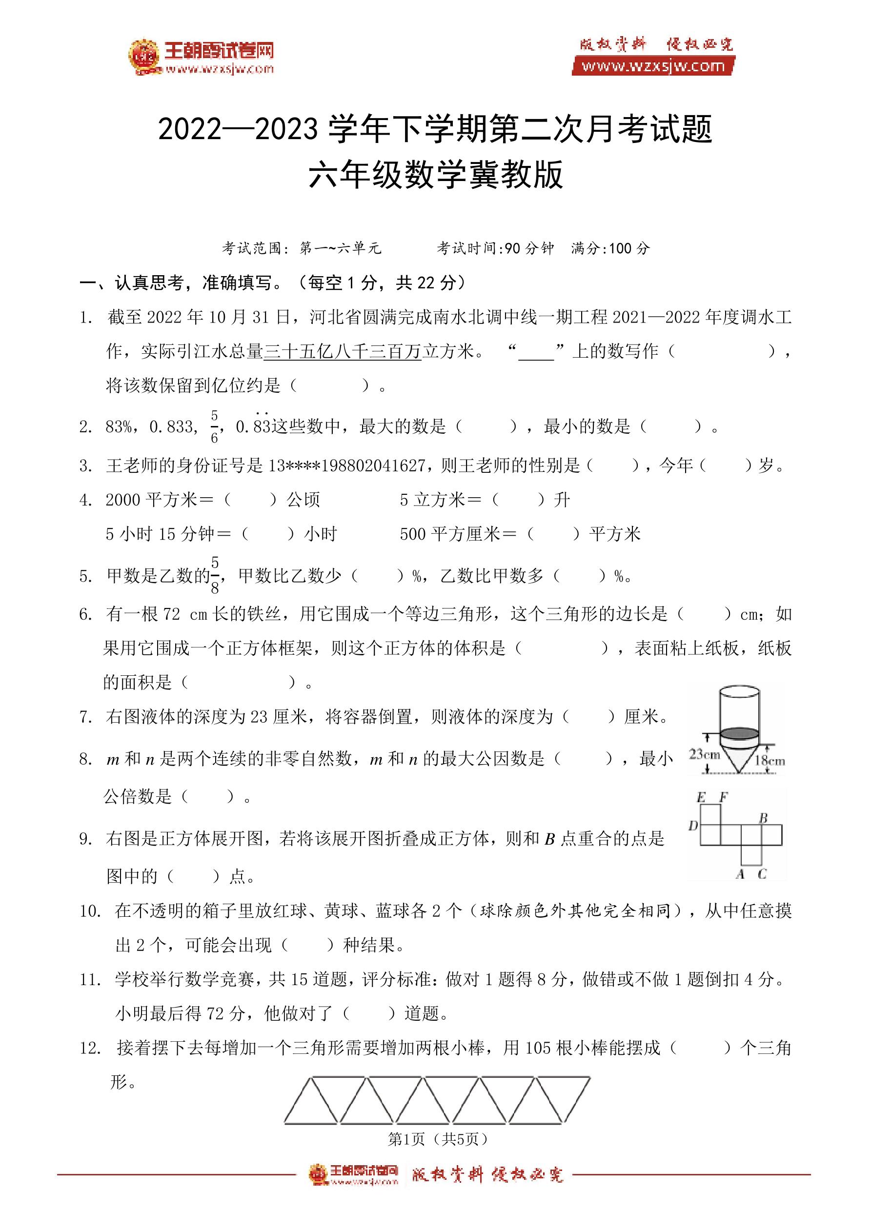 2022—2023学年下学期第二次月考试题六年级数学(冀教版)