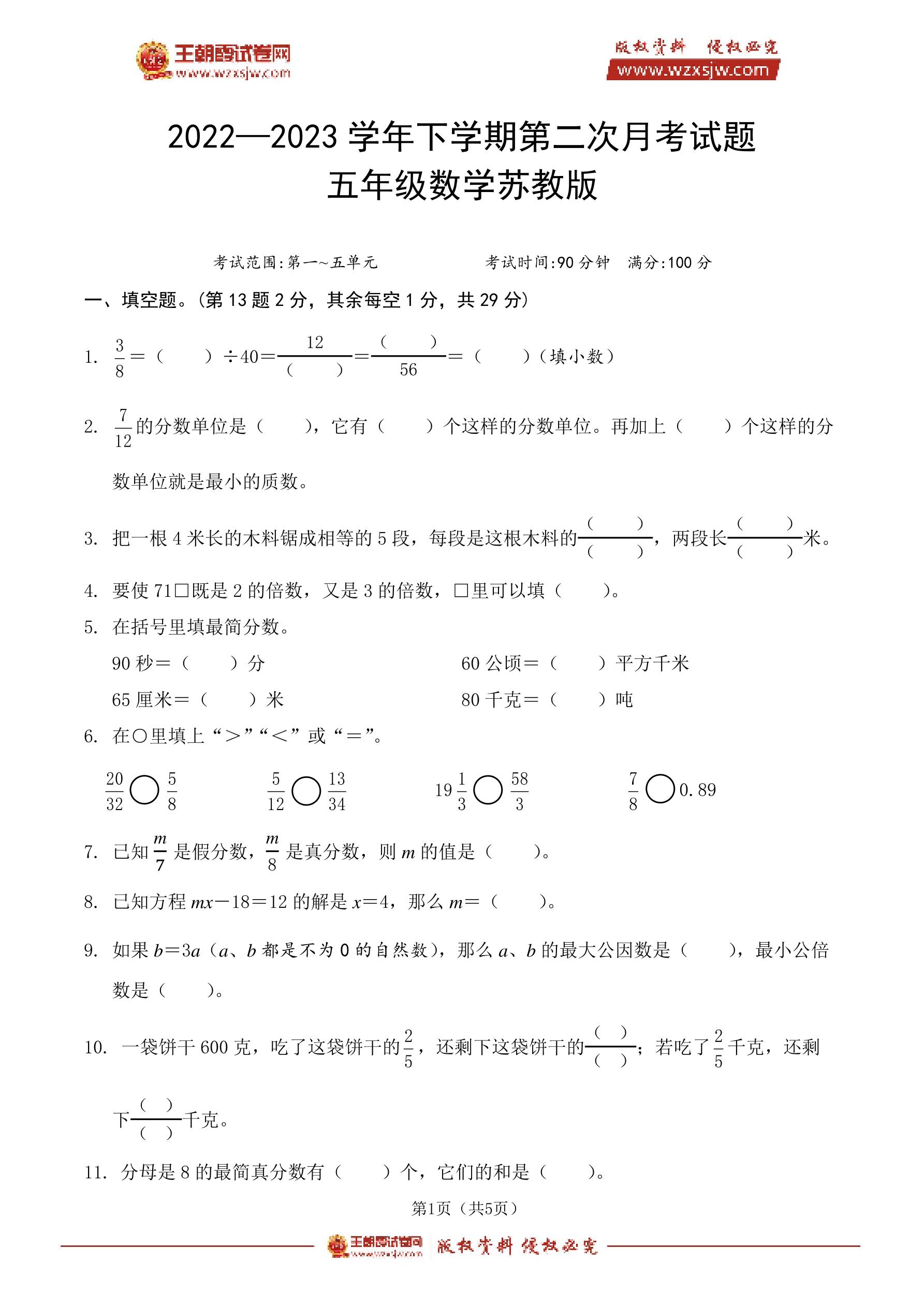 2022—2023学年下学期第二次月考试题五年级数学(苏教版)