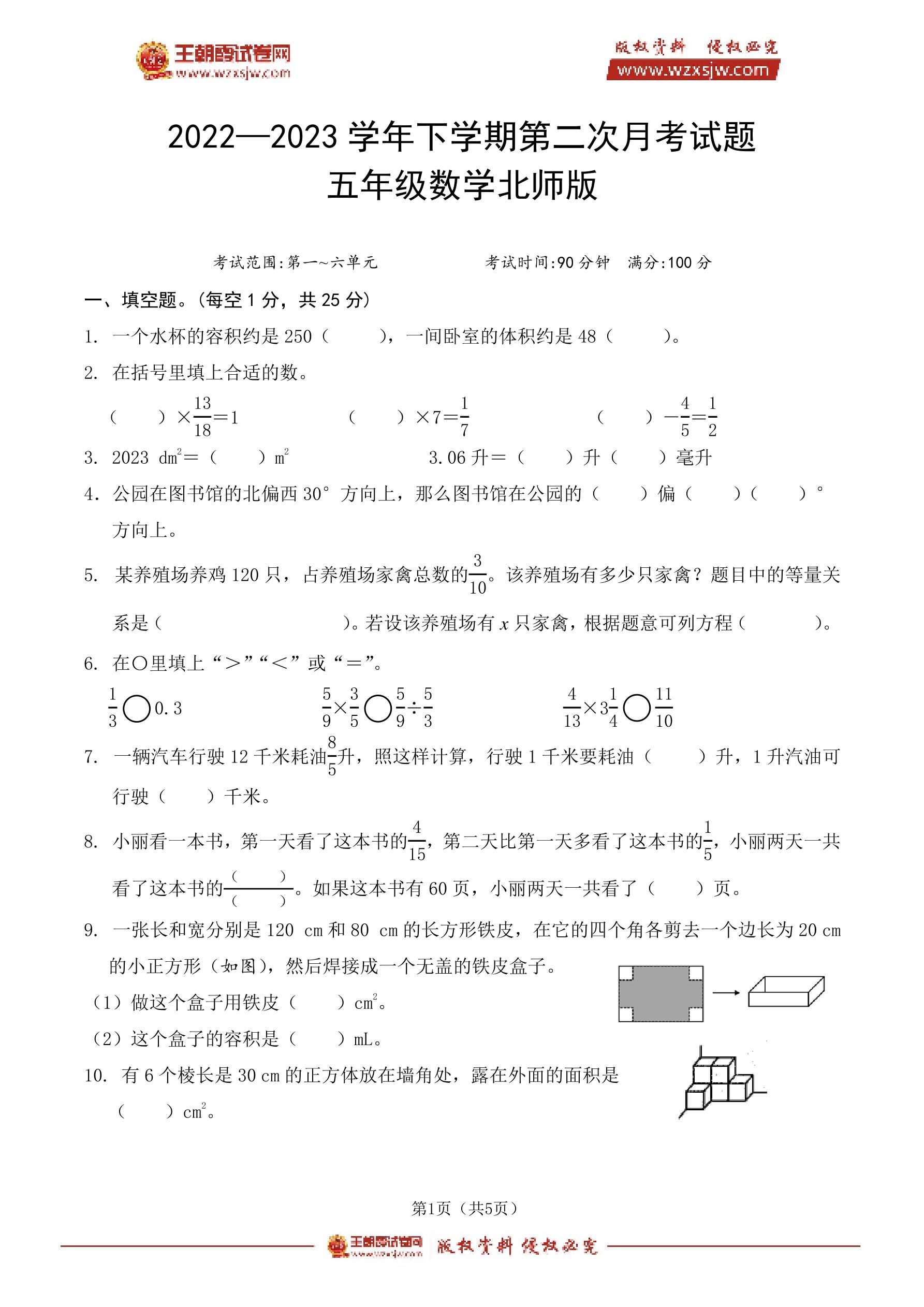2022—2023学年下学期第二次月考试题五年级数学(北师版)