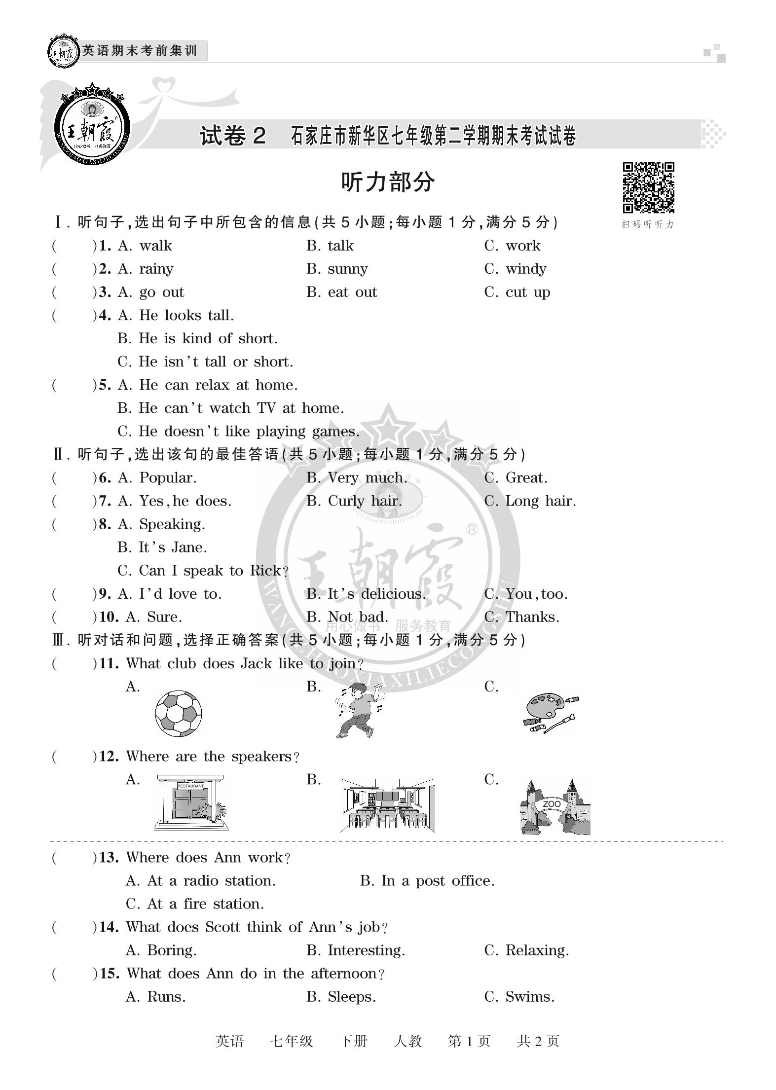 试卷2 石家庄市新华区 七年级下册英语人教版