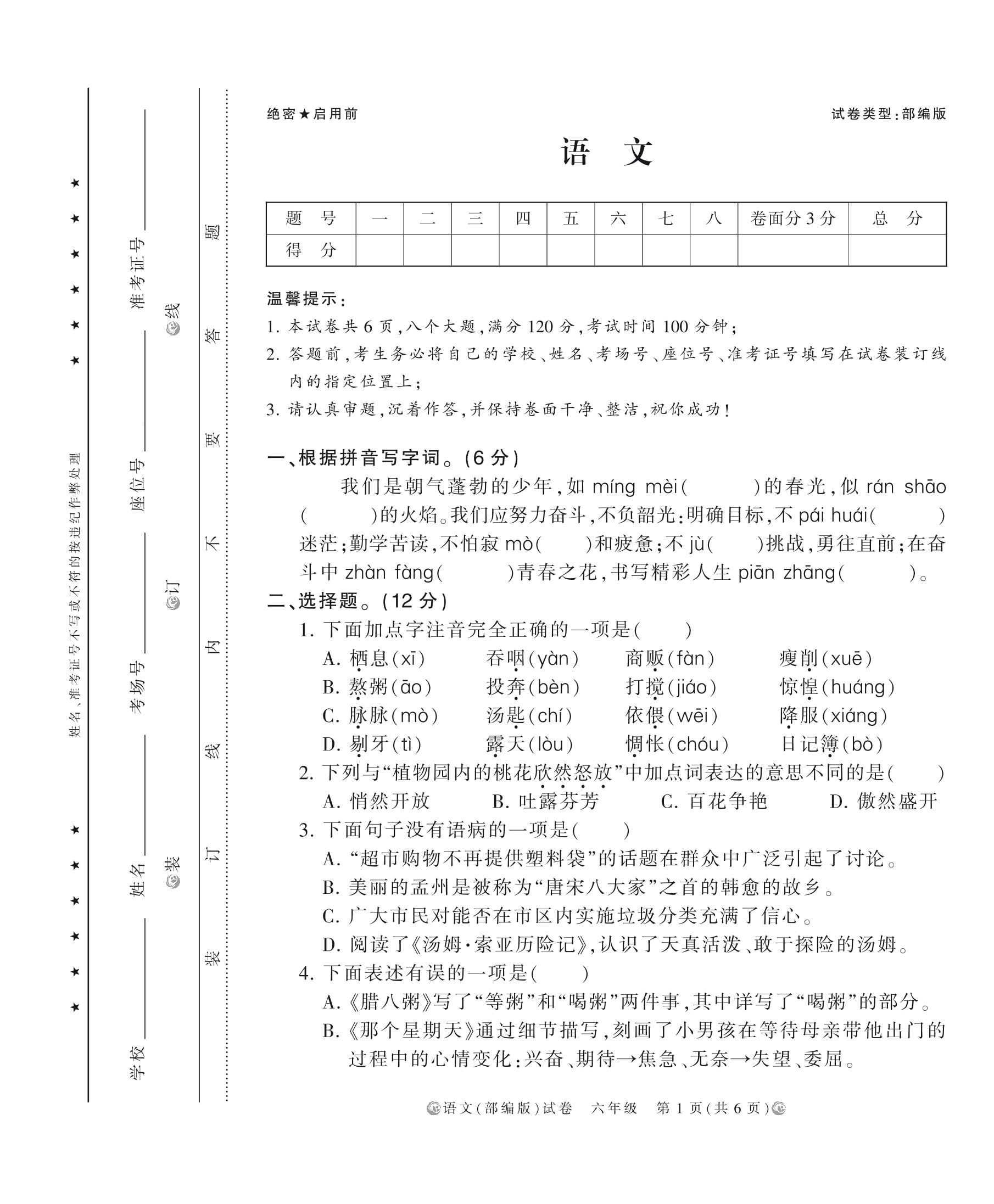 河南省焦作市孟州市2021春小升初择优考试六年级语文(人教版)