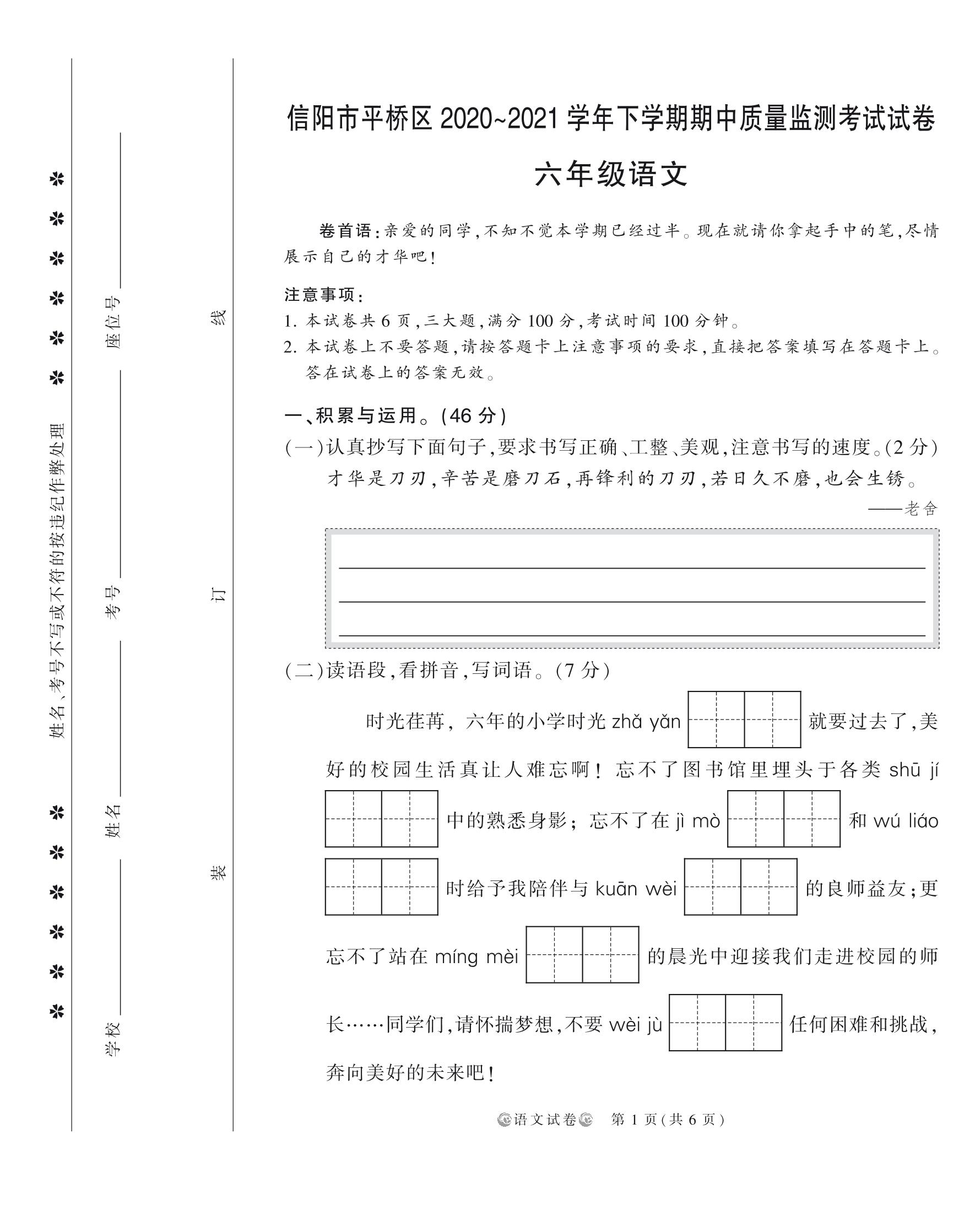 河南省信阳市平桥区2020-2021学年下学期期中质量监测考试试卷六年级语文(人教版)