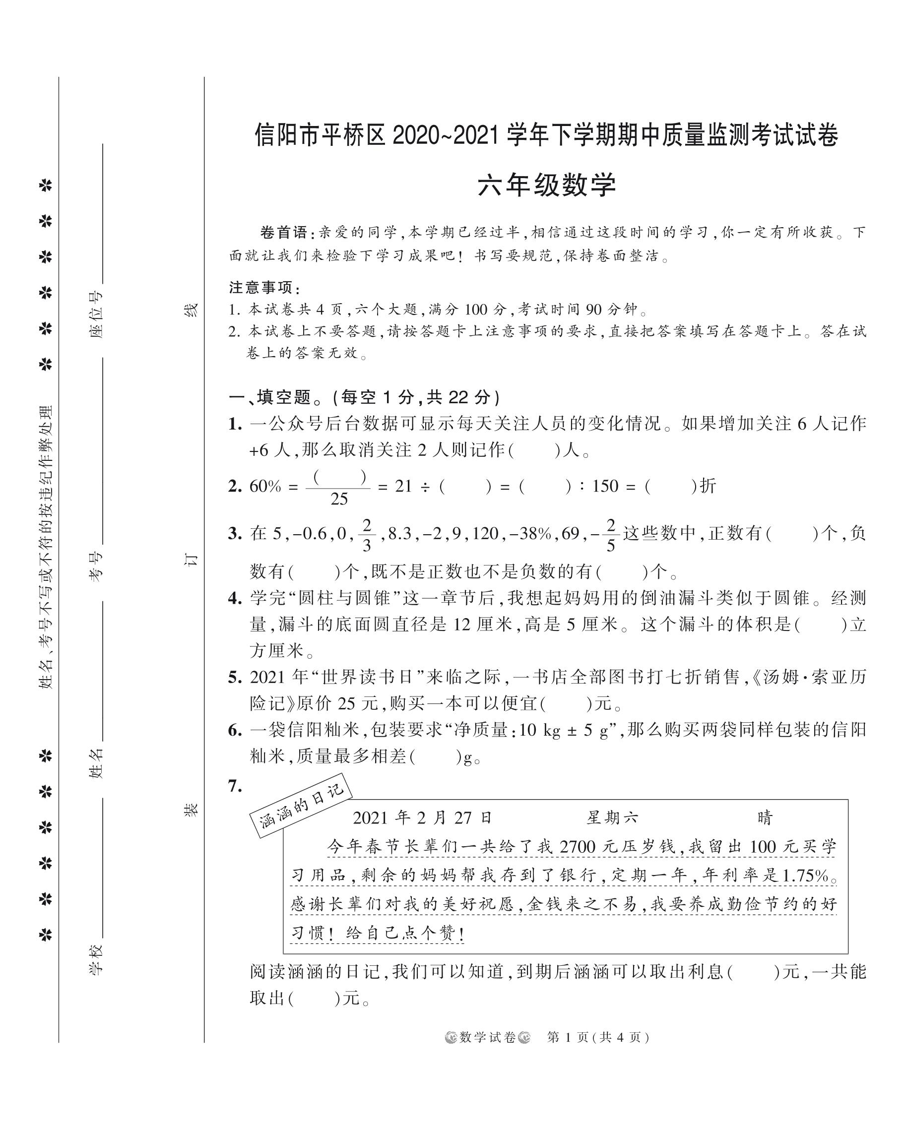 河南省信阳市平桥区2020-2021学年下学期期中质量监测考试试卷六年级数学(人教版)
