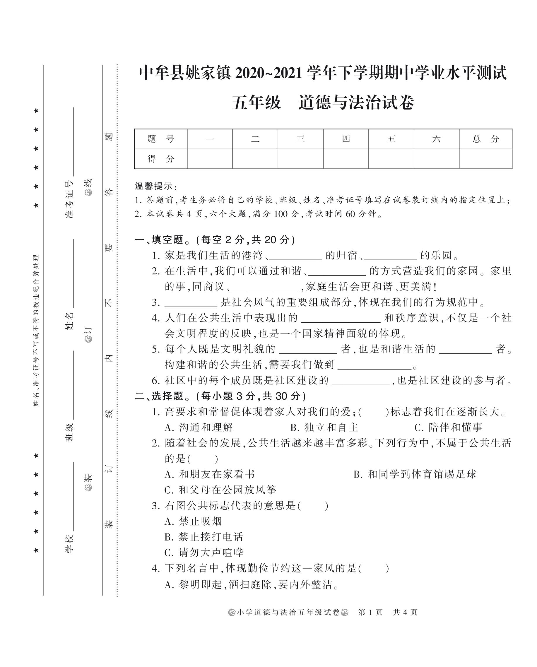 河南省郑州市中牟县姚家镇2020~2021学年下学期期中学业水平测试试卷五年级道德与法治(人教版)