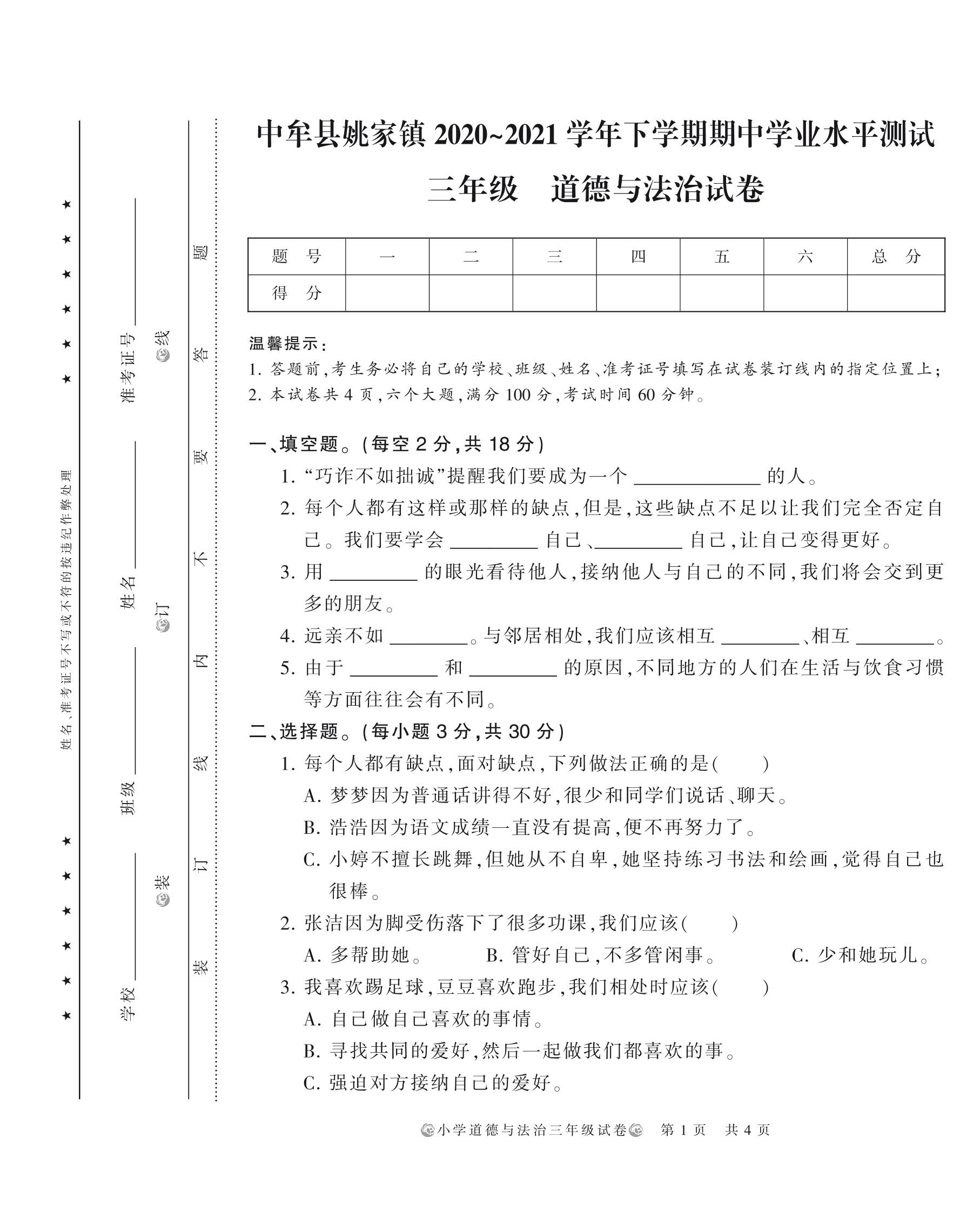 河南省郑州市中牟县姚家镇2020~2021学年下学期期中学业水平测试试卷三年级道德与法治(人教版)
