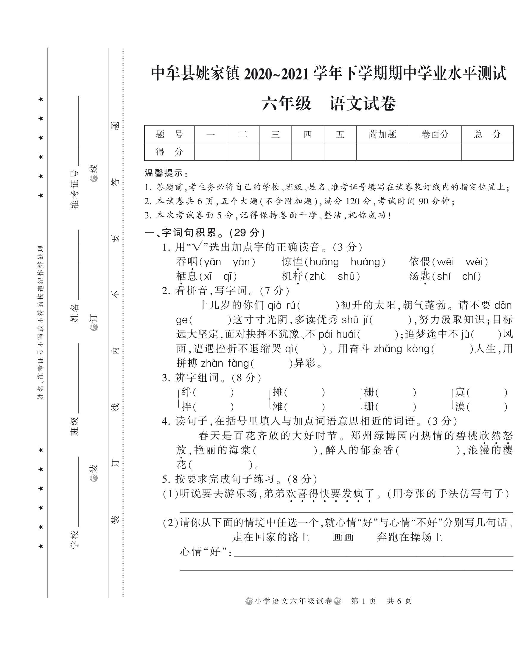 河南省郑州市中牟县姚家镇2020~2021学年下学期期中学业水平测试试卷六年级语文(人教版)