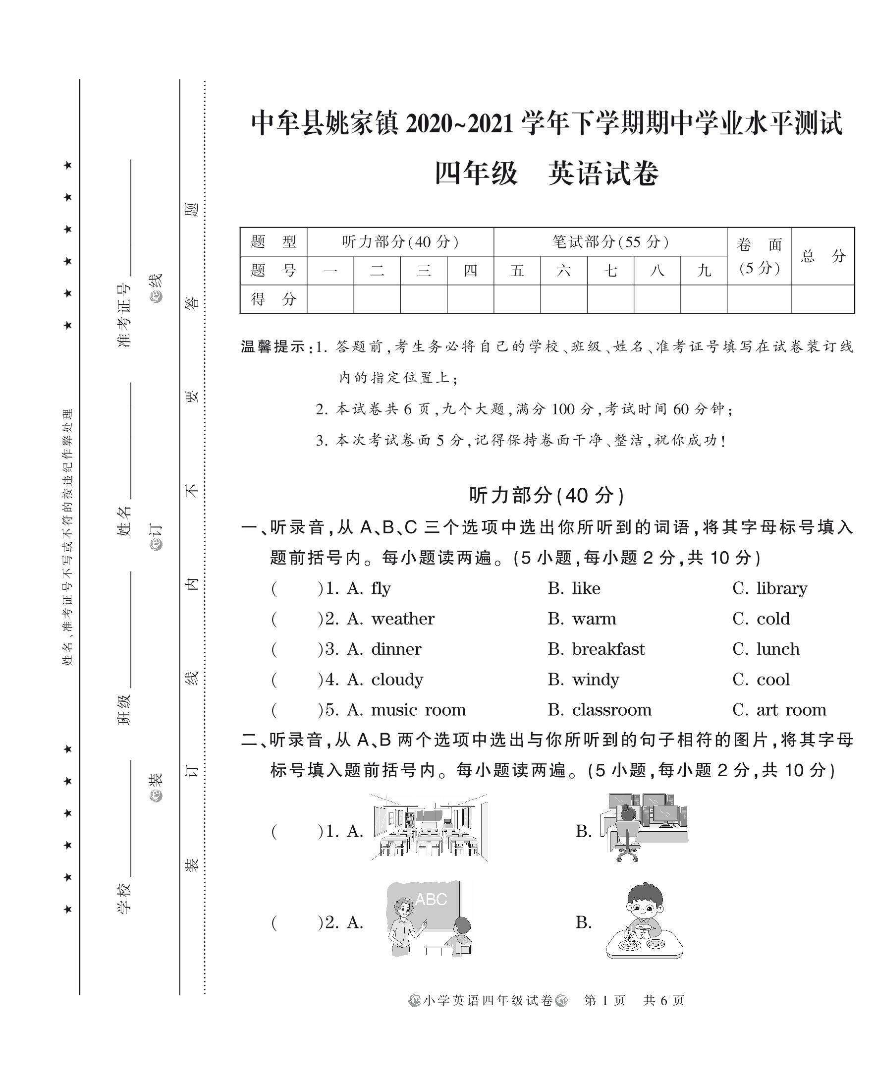 河南省郑州市中牟县姚家镇2020~2021学年下学期期中学业水平测试试卷四年级英语(人教PEP版)