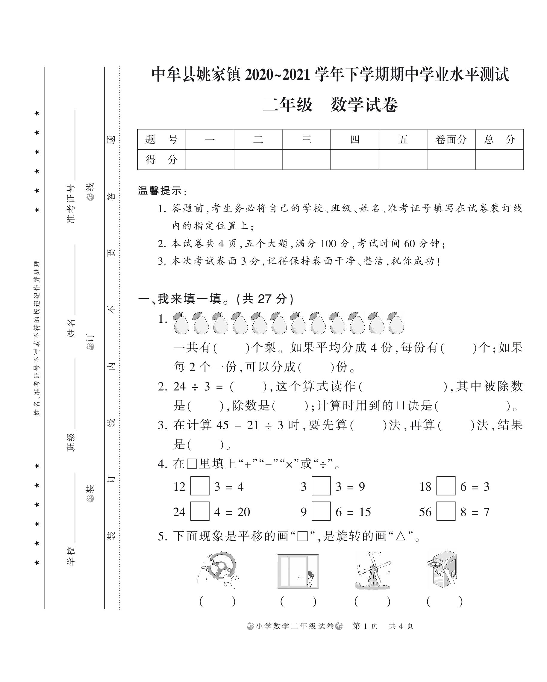 河南省郑州市中牟县姚家镇2020~2021学年下学期期中学业水平测试试卷二年级数学(人教版)