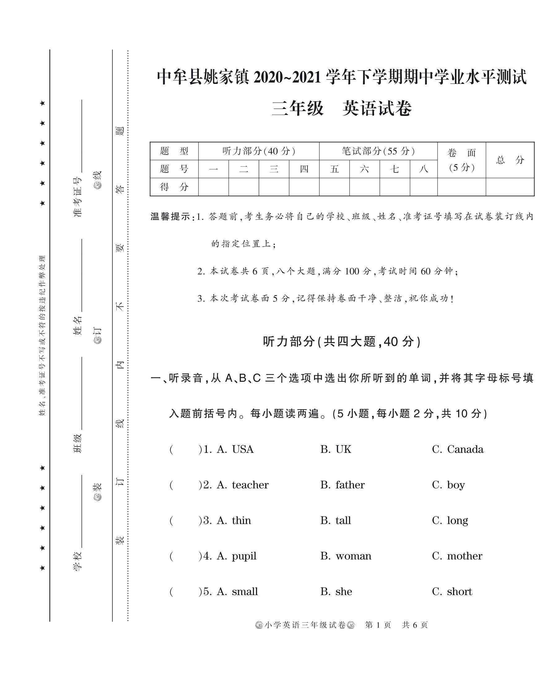 河南省郑州市中牟县姚家镇2020~2021学年下学期期中学业水平测试试卷三年级英语(人教PEP版)