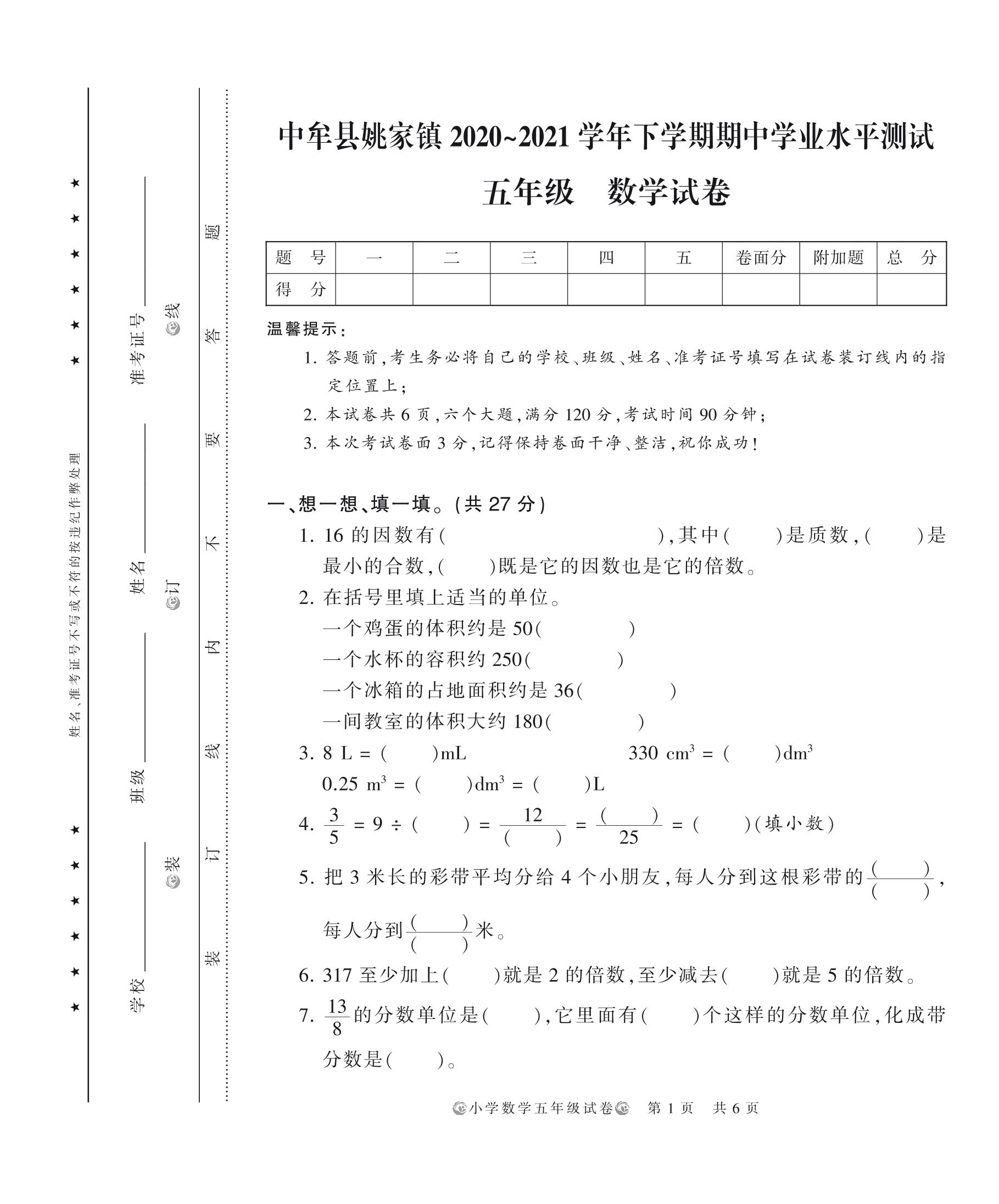 河南省郑州市中牟县姚家镇2020~2021学年下学期期中学业水平测试试卷五年级数学(人教版)