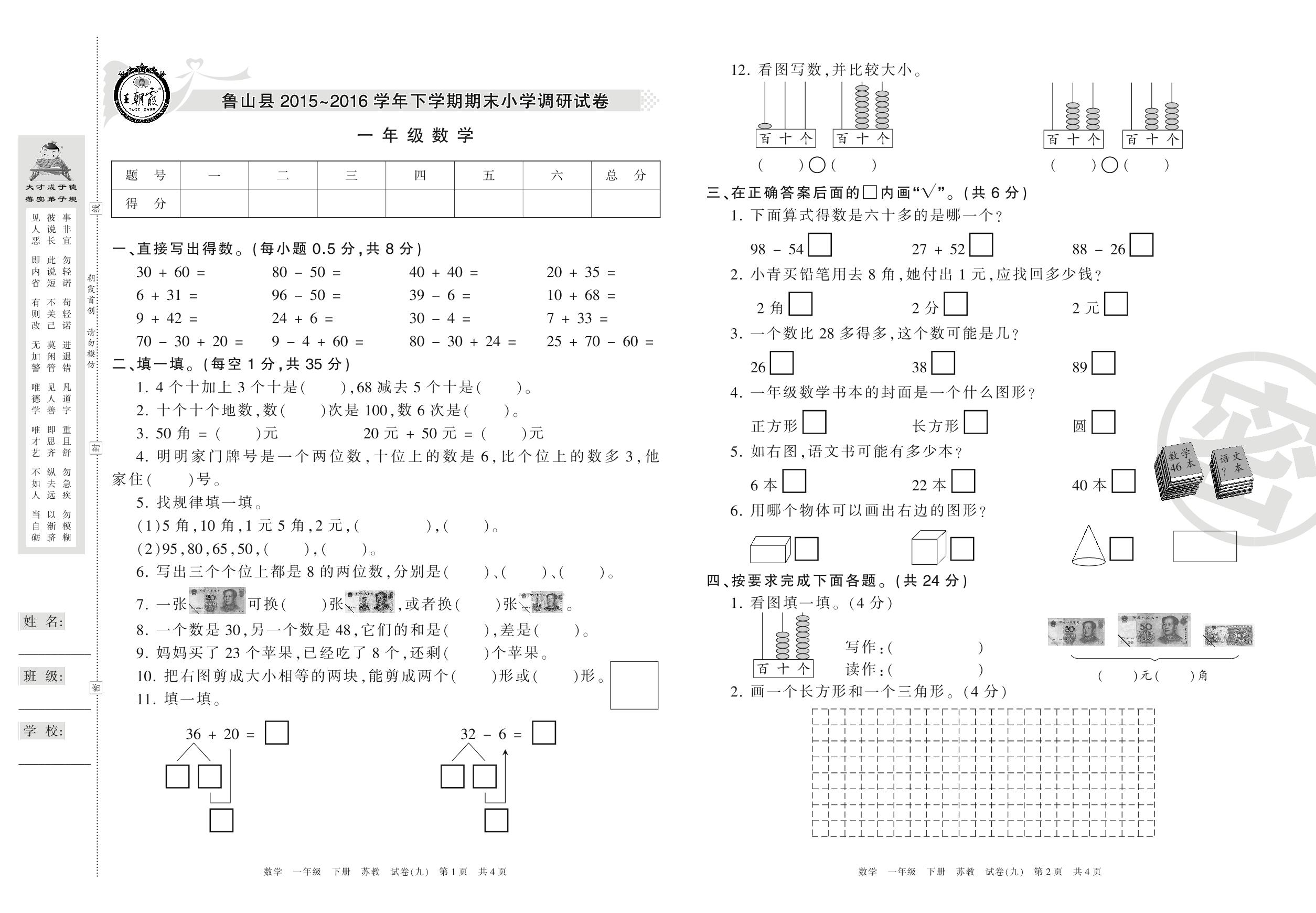 2015-2016学年第二学期平顶山市鲁山县一年级数学试卷(苏教版)【9】