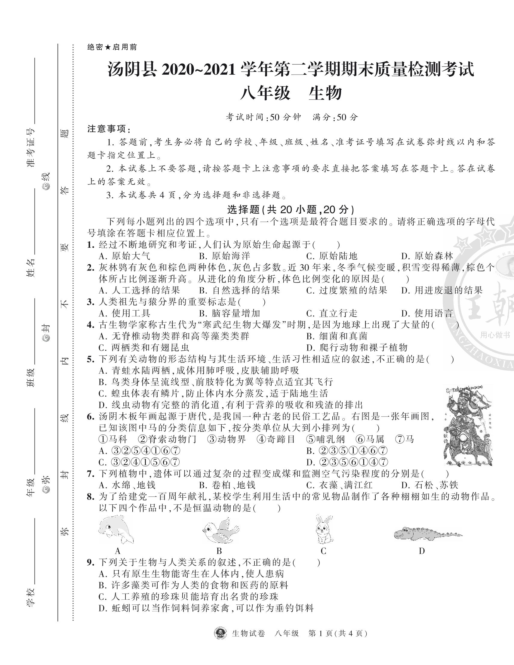 河南省安阳市汤阴县2020-2021学年第二学期期末质量检测考试八年级生物(北师版)