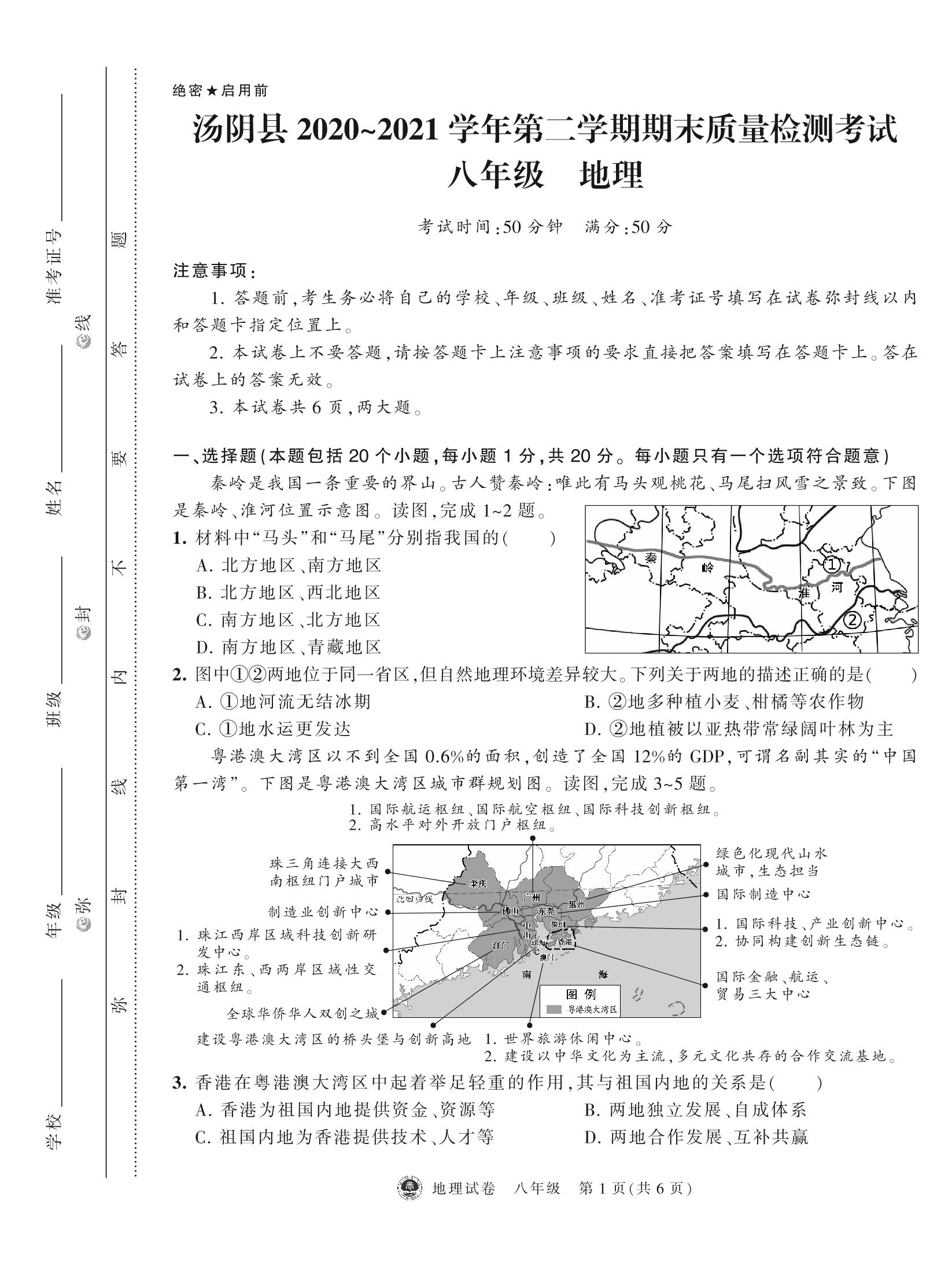 河南省安阳市汤阴县2020-2021学年第二学期期末质量检测考试八年级地理(人教版)