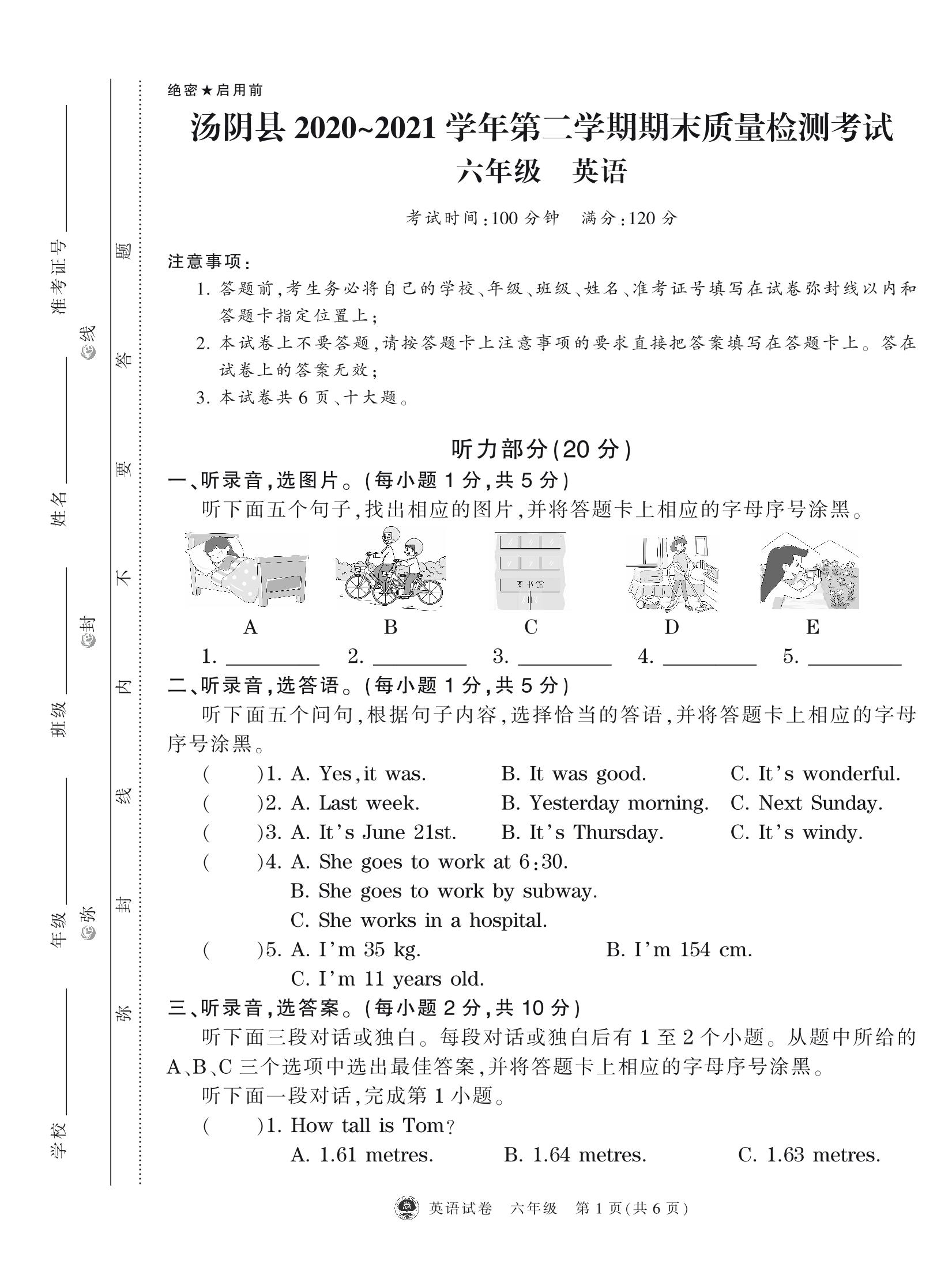河南省安阳市汤阴县2020-2021学年第二学期期末质量检测考试六年级英语(人教PEP版)