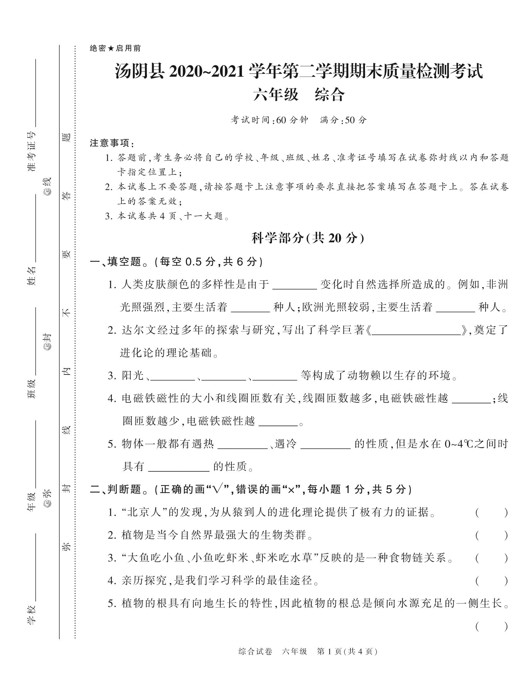 河南省安阳市汤阴县2020-2021学年第二学期期末质量检测考试六年级综合(科学、道德与法治、音乐、美术)