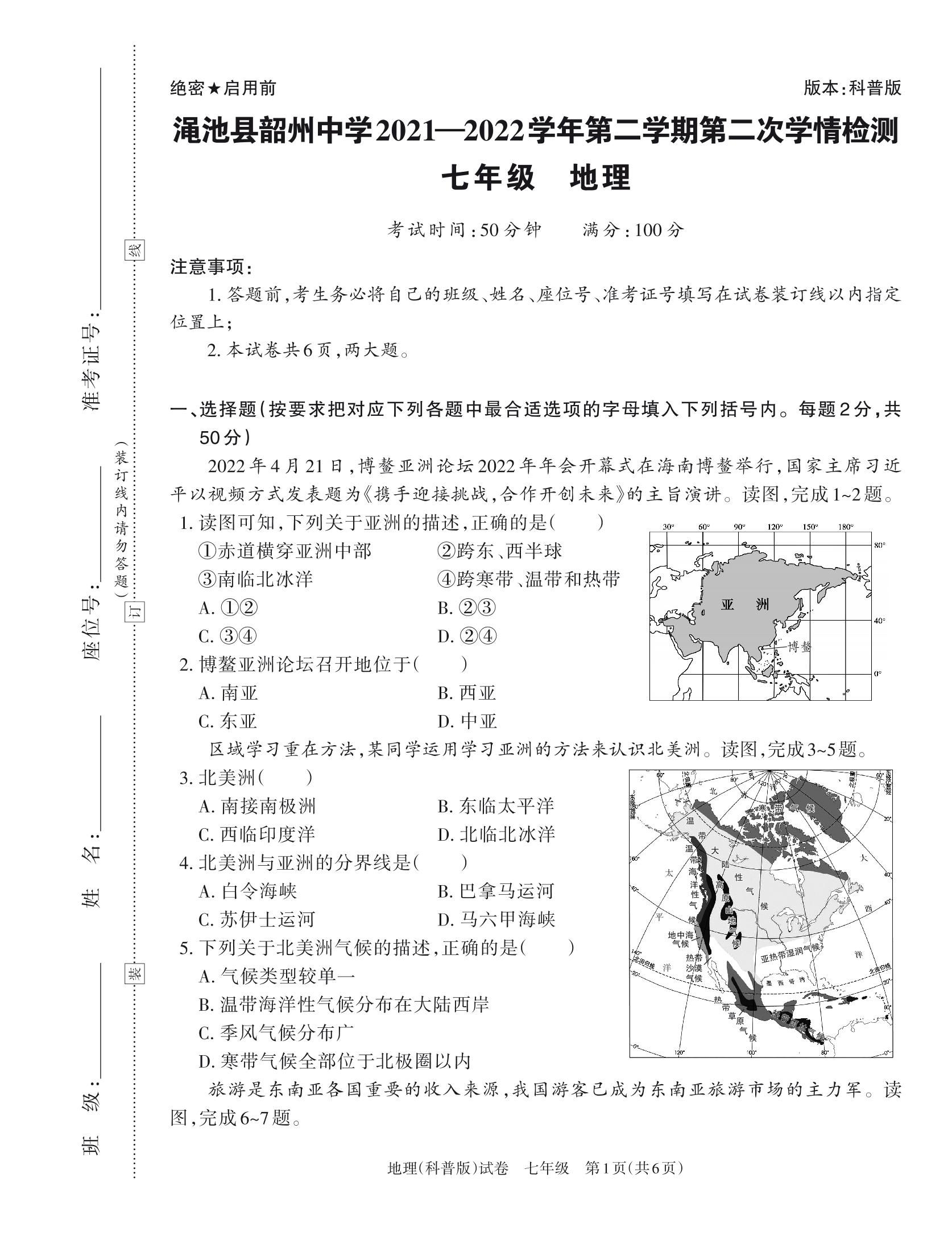河南省三门峡市渑池县某中学2021-2022学年第二学期第二次学情检测七年级地理(科普版)