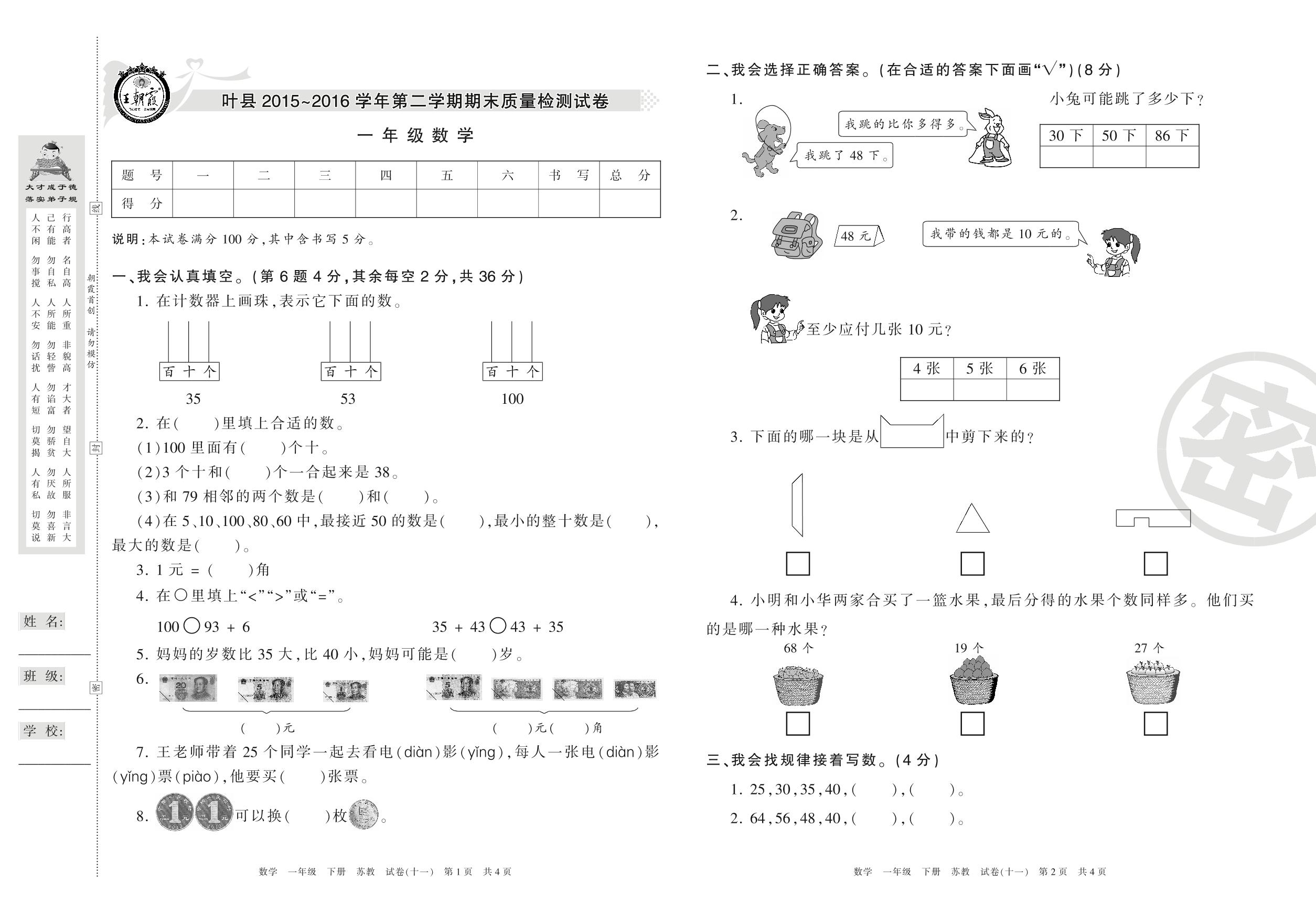 2015-2016学年第二学期平顶山市叶县一年级数学试卷(苏教版)【11】